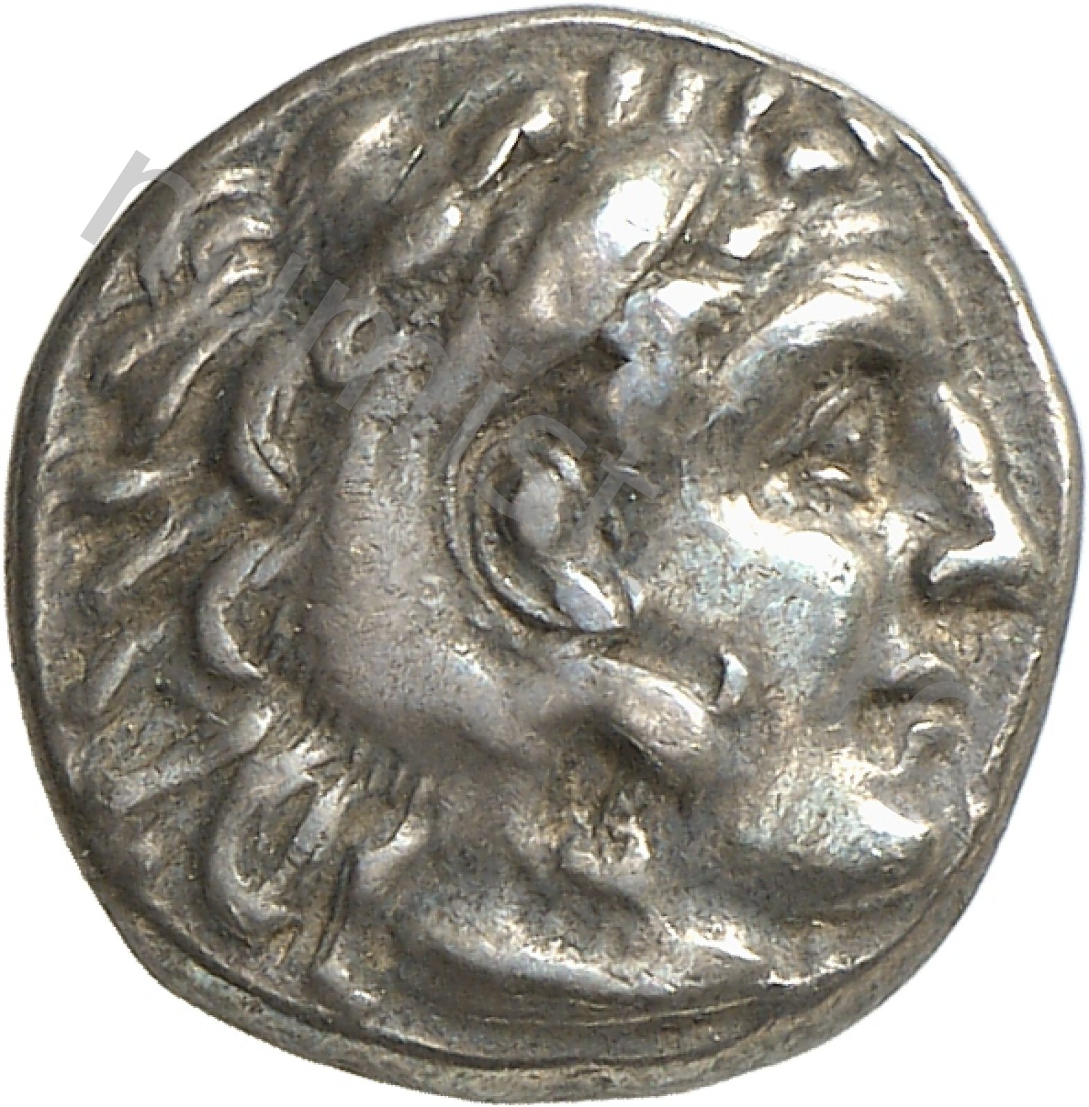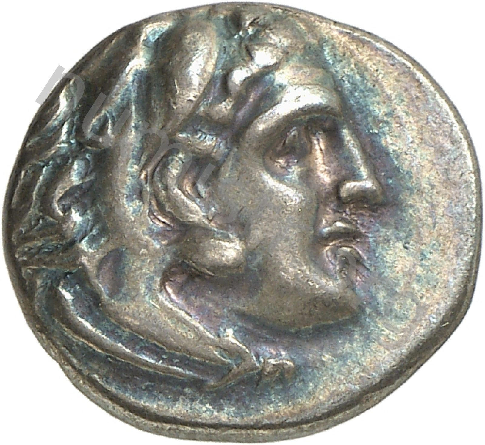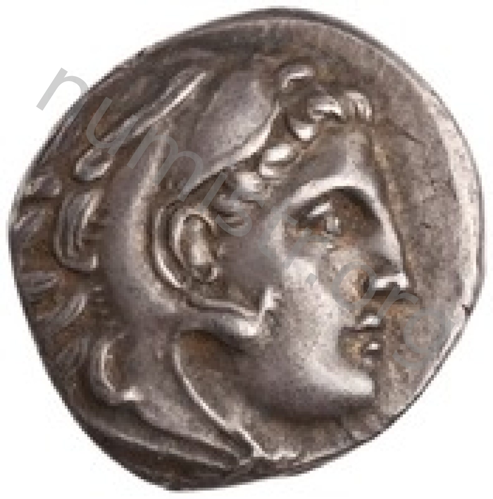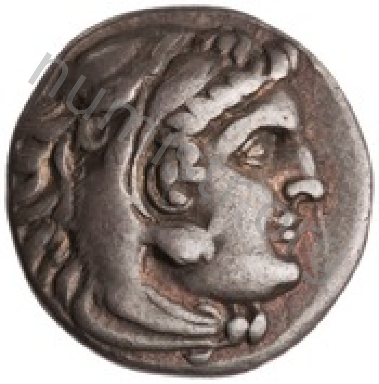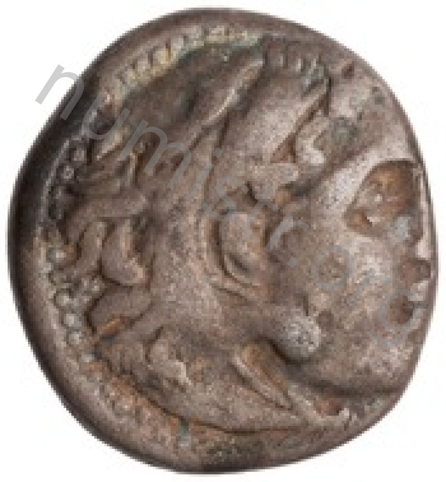 Head of beardless Heracles right wearing lion skin headdress -[en]
