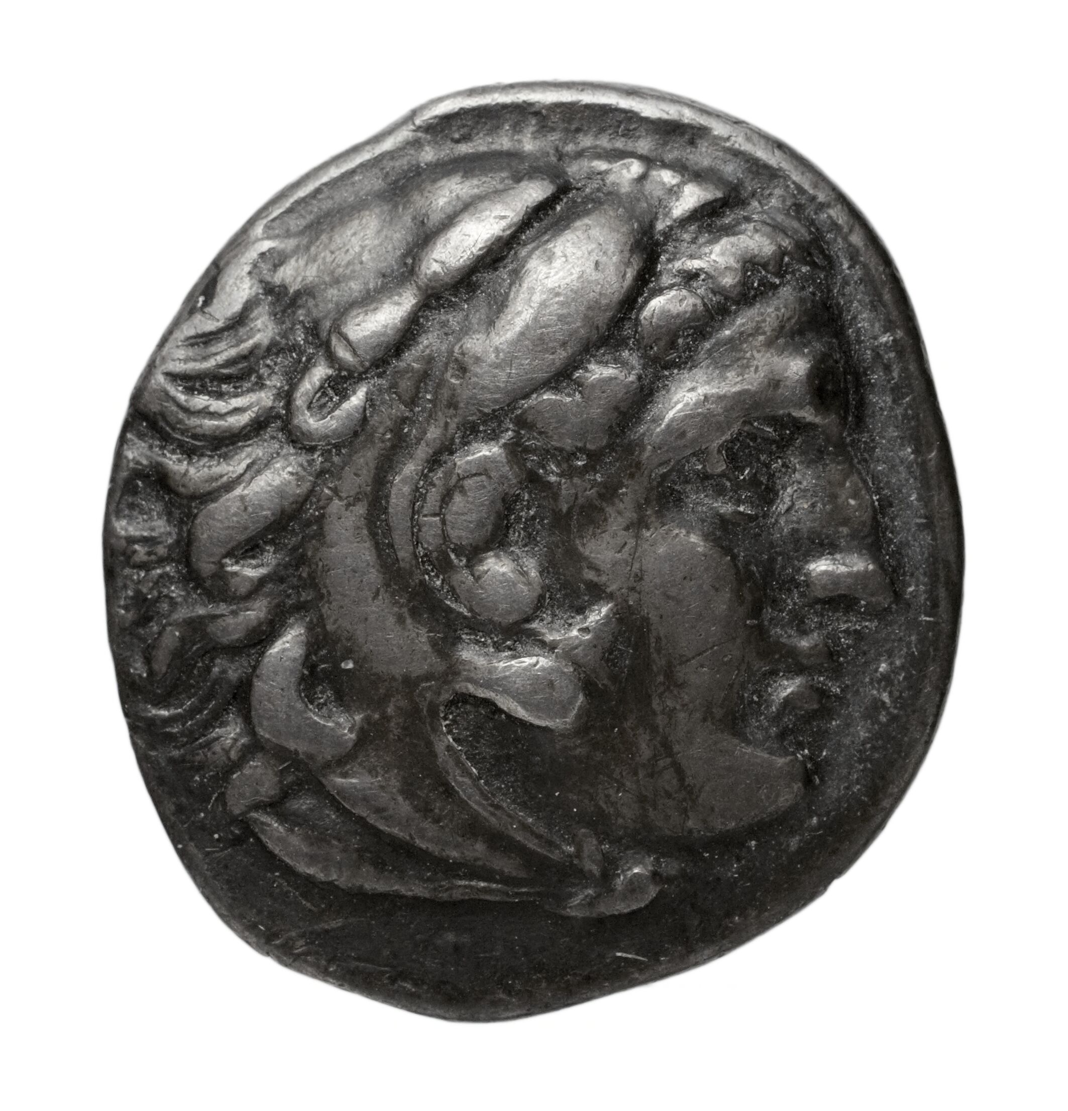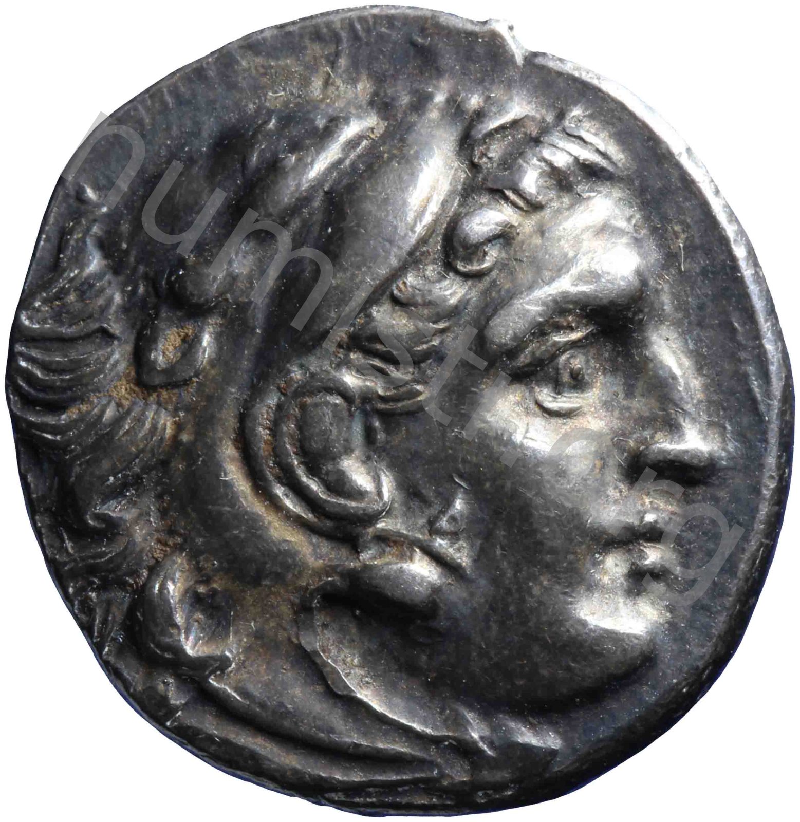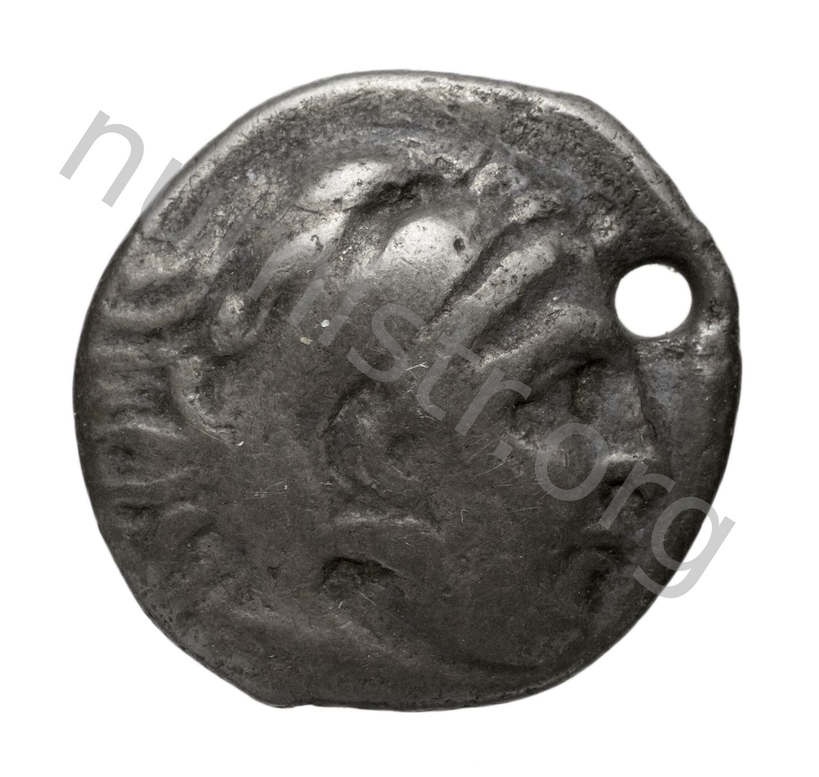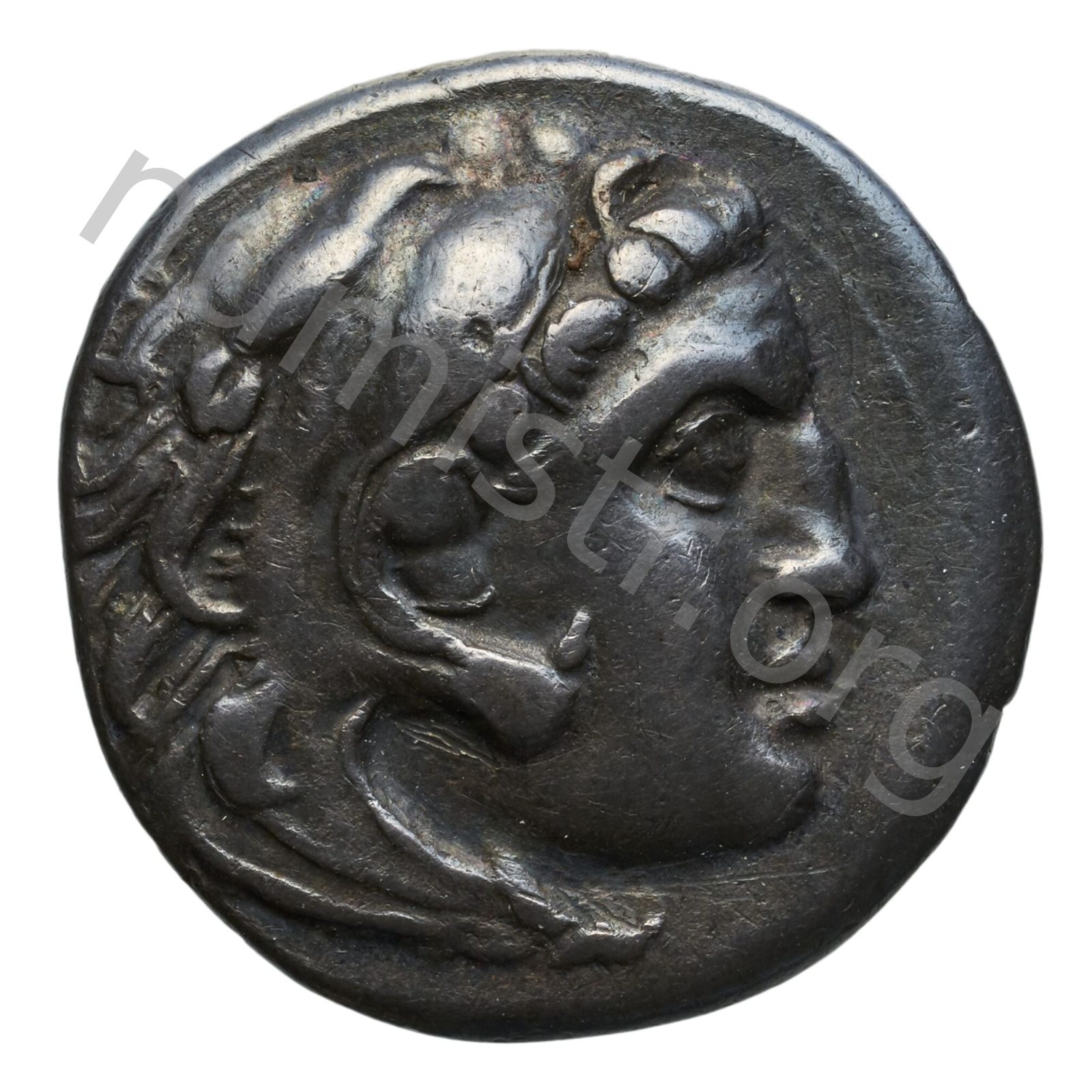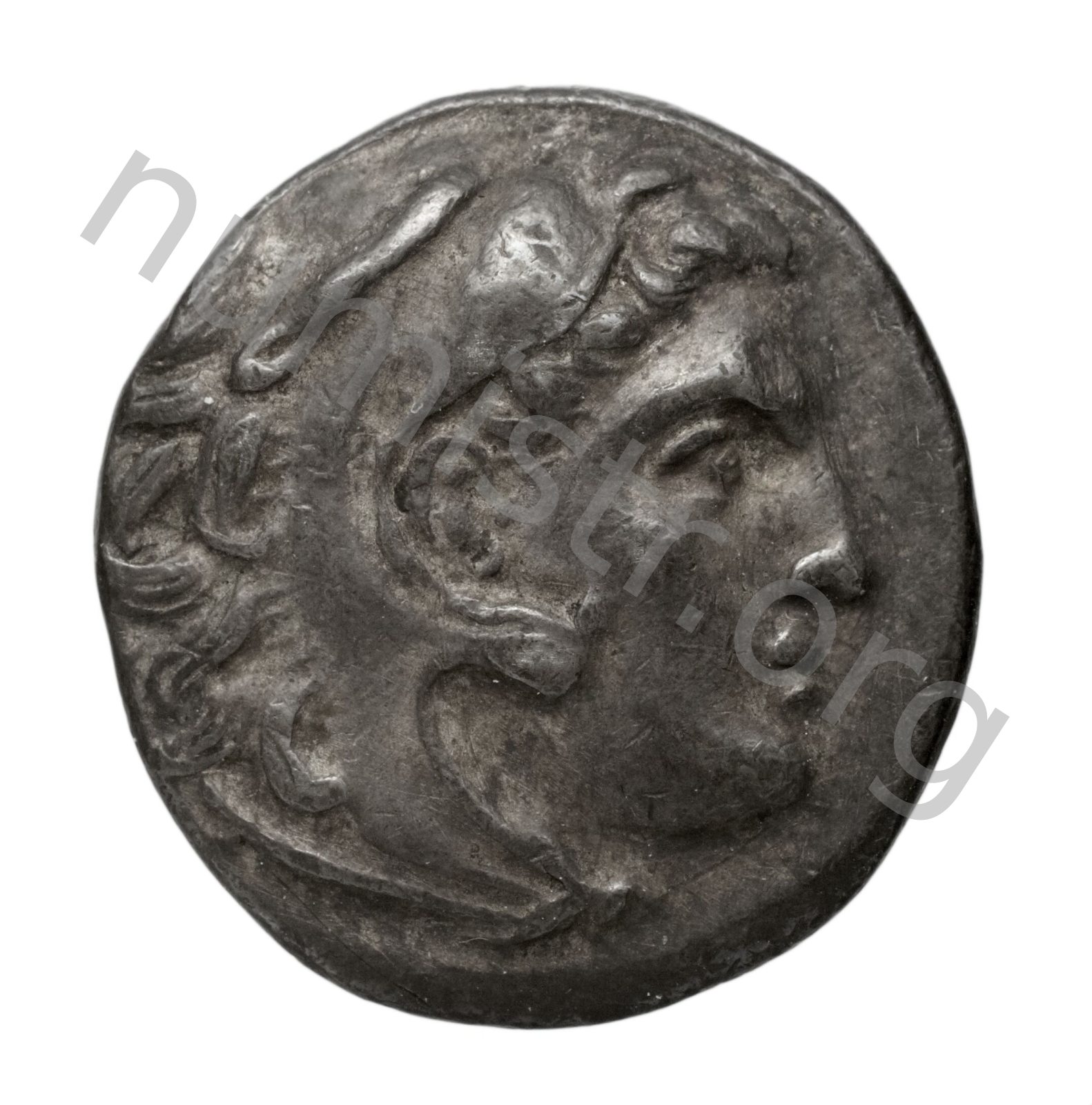 Head of beardless Heracles right wearing lion skin headdress -[en]