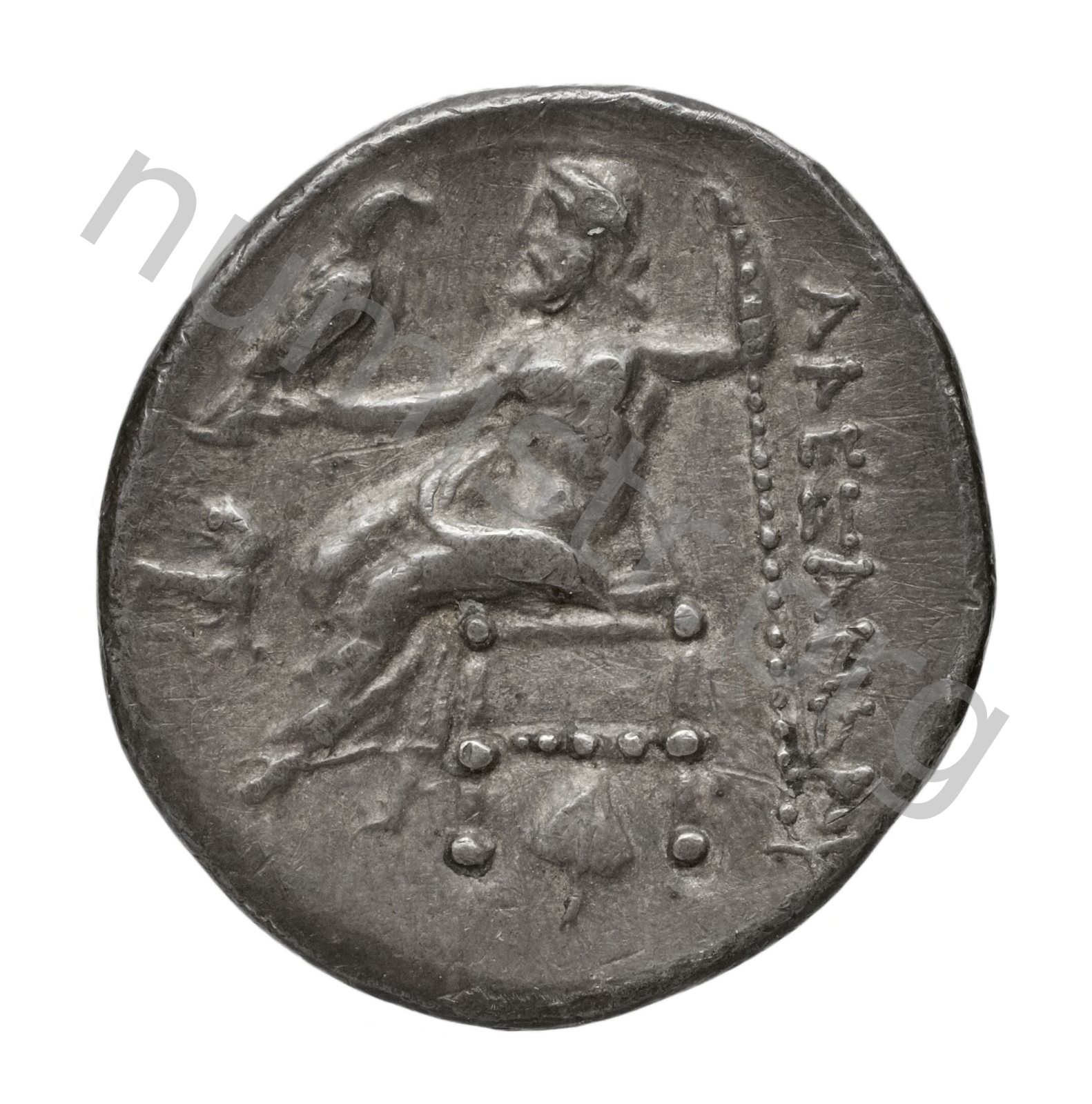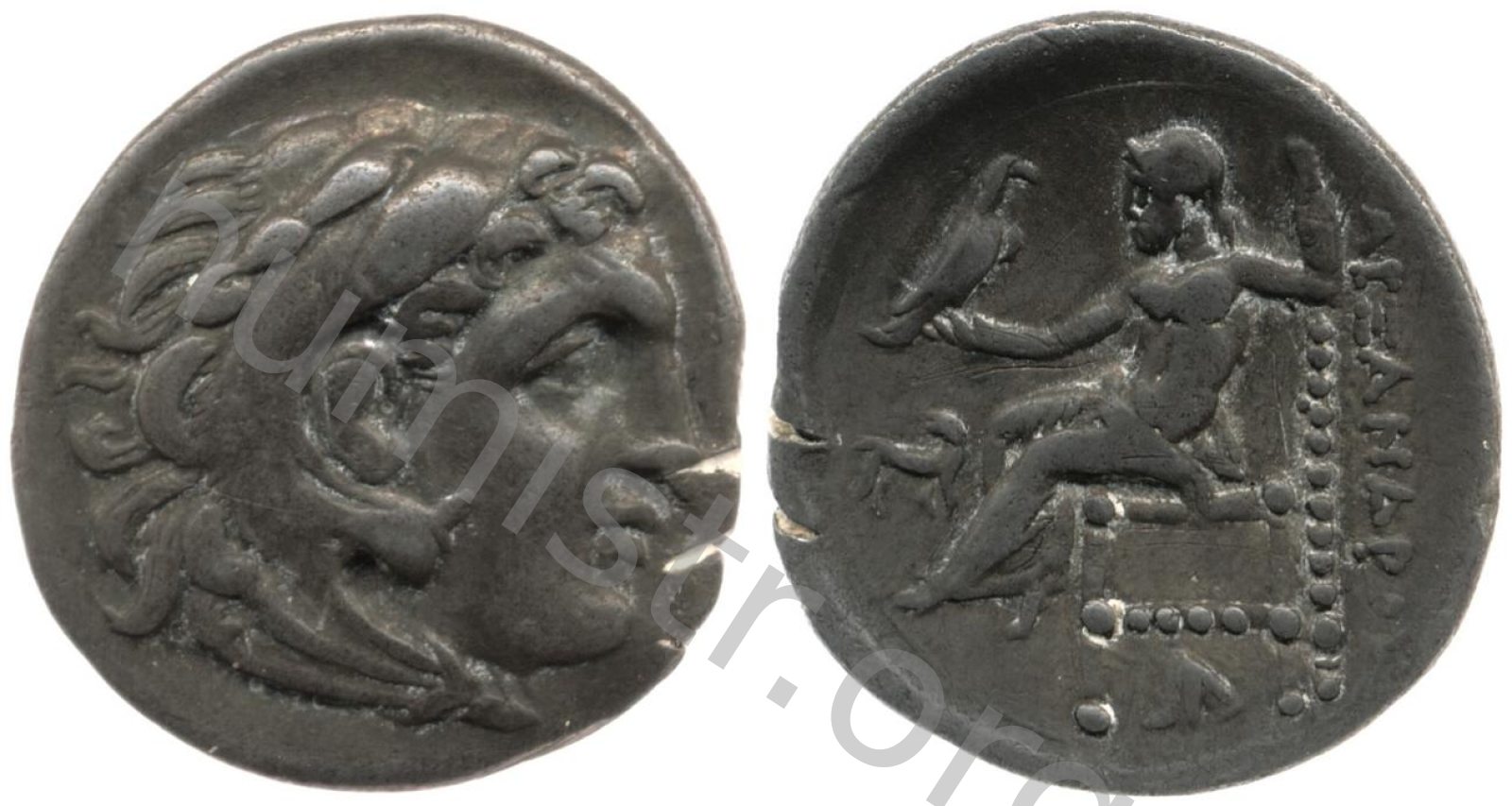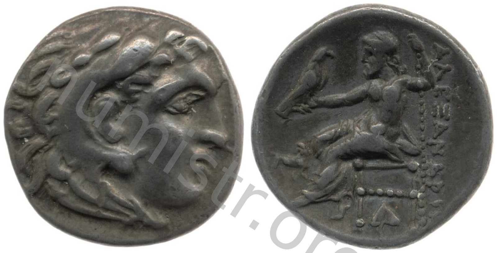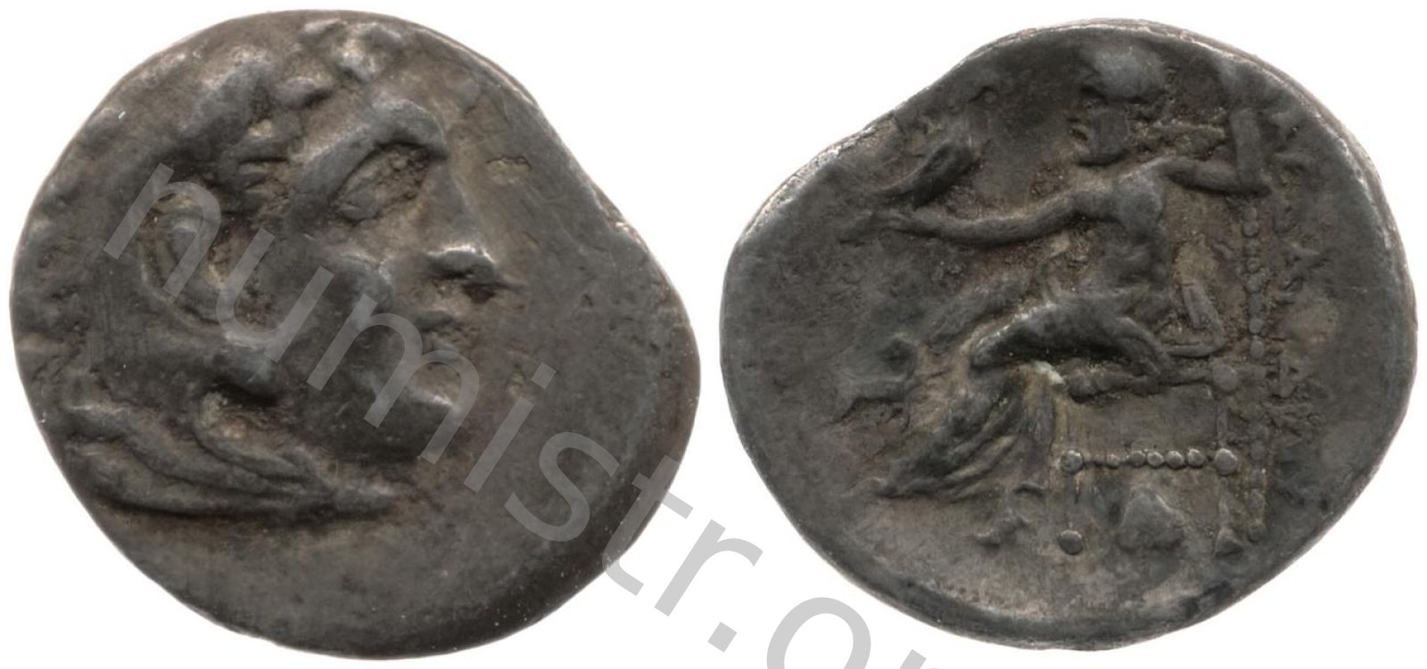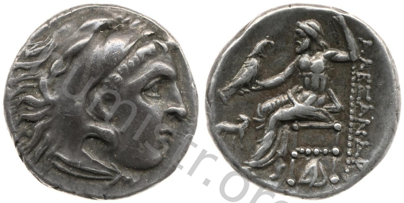 Head of beardless Heracles right wearing lion skin headdress -[en]