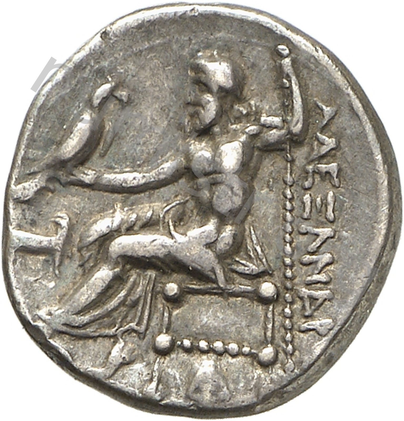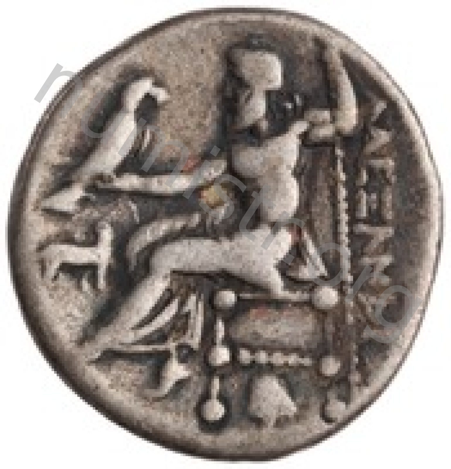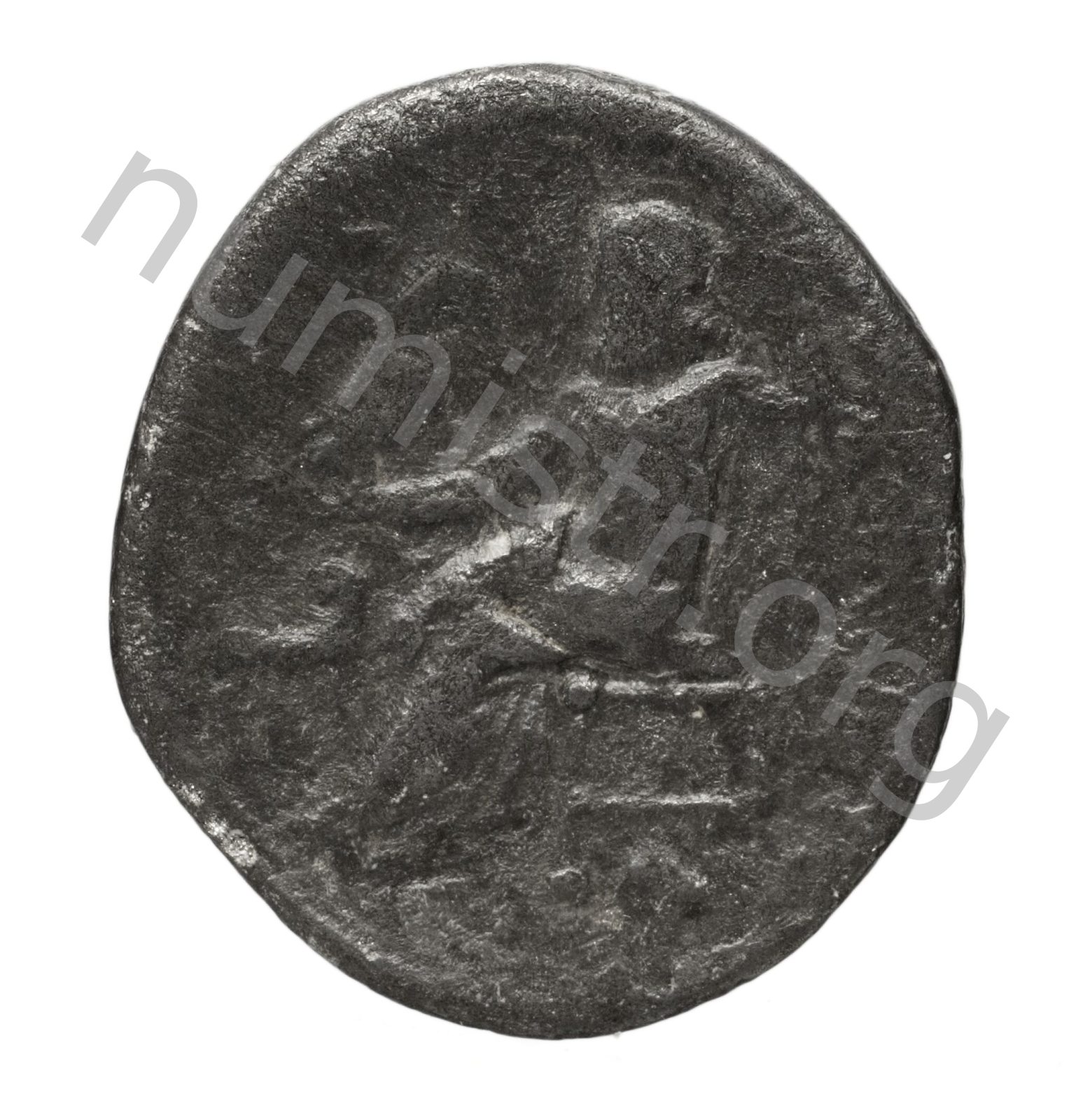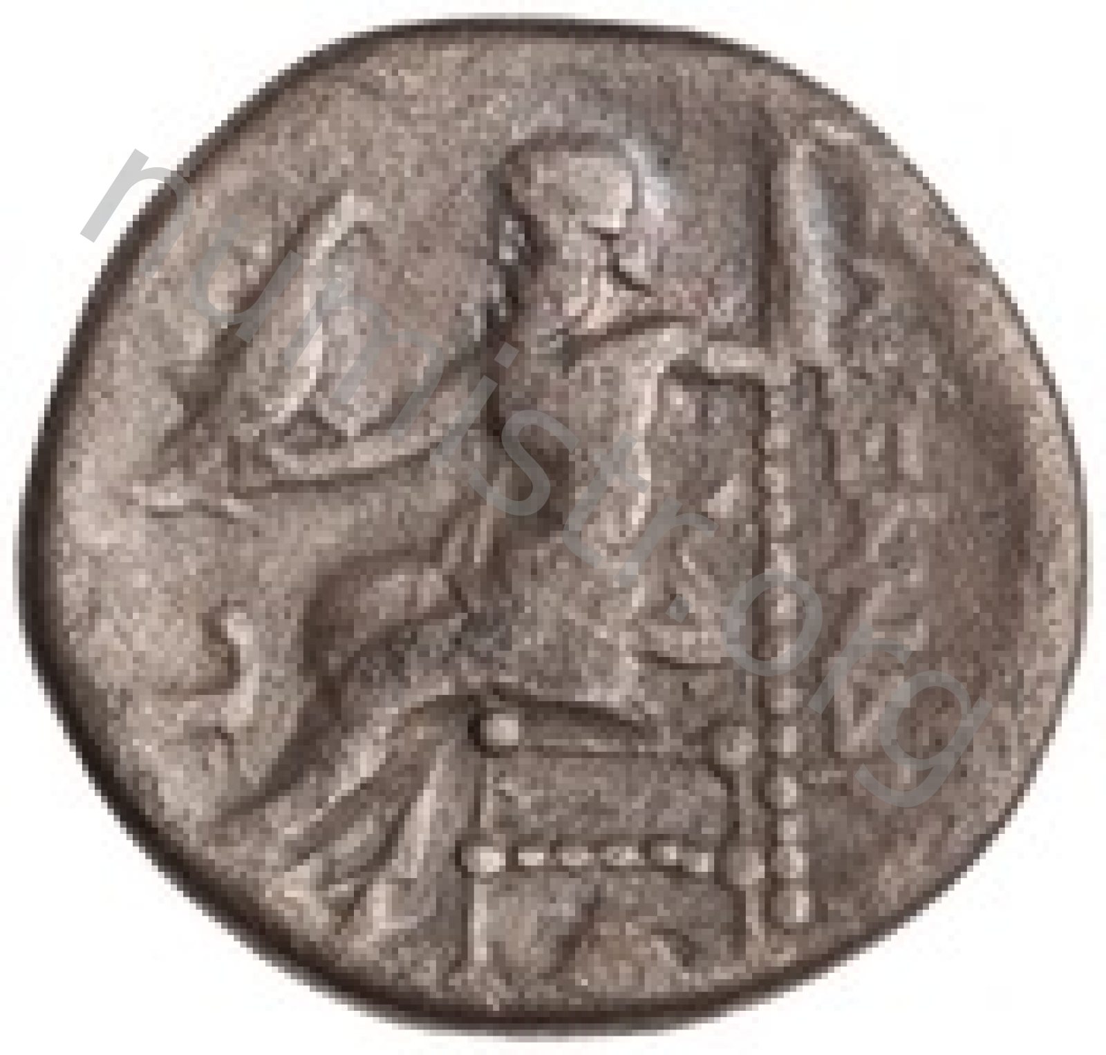Zeus seated on stool-throne left eagle on outstretched right hand sceptre in left hand -[en]