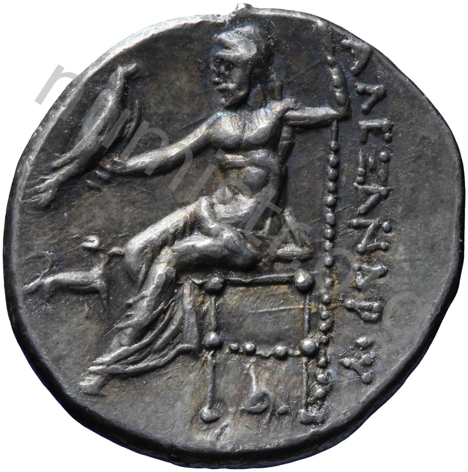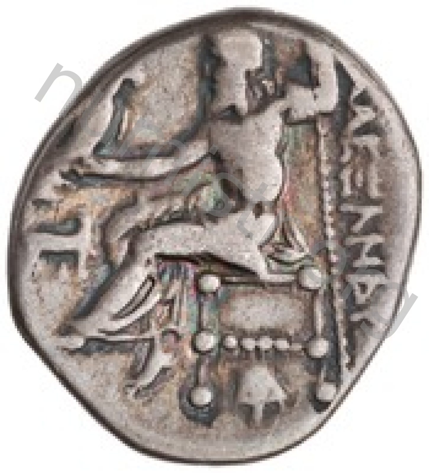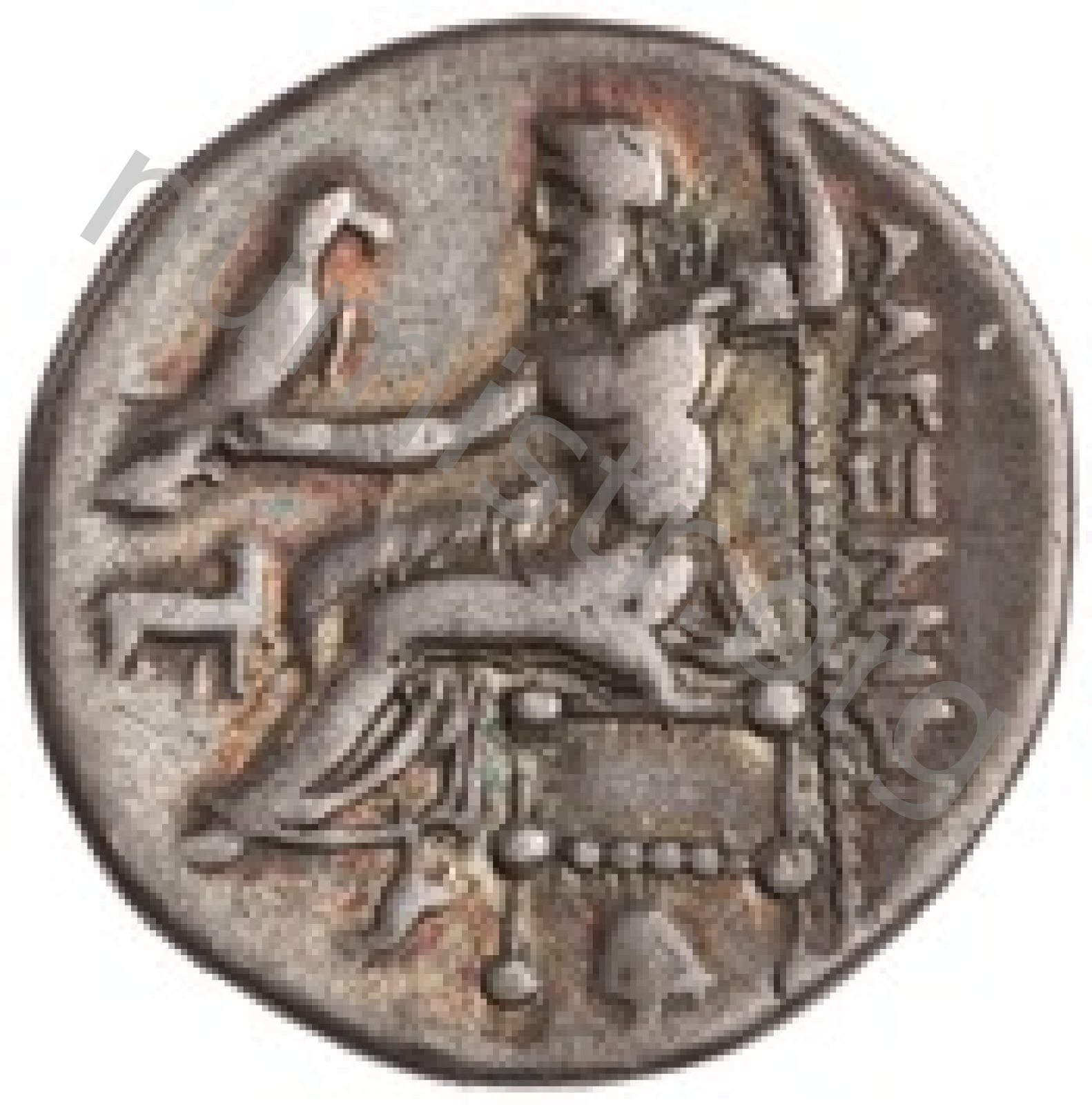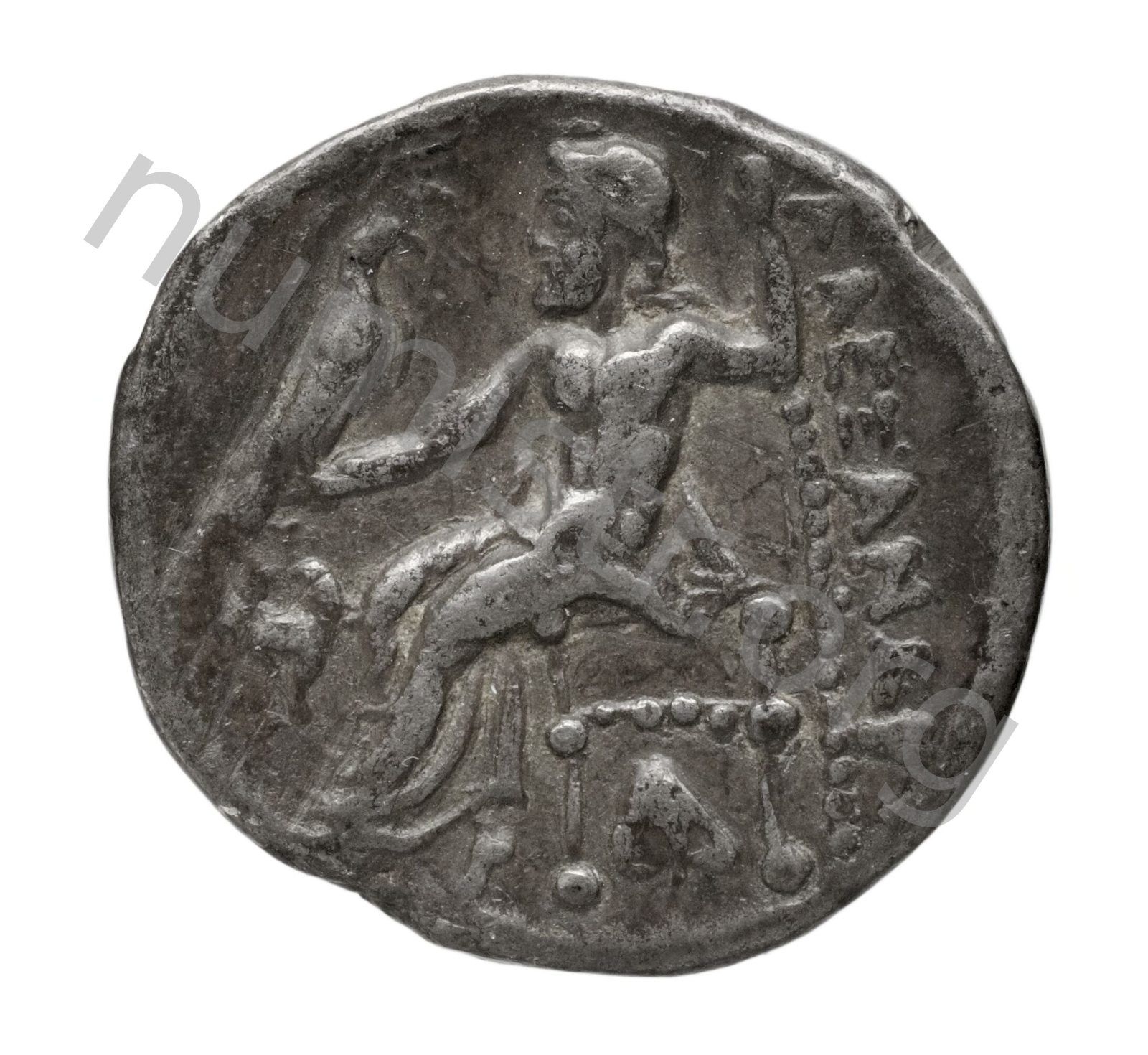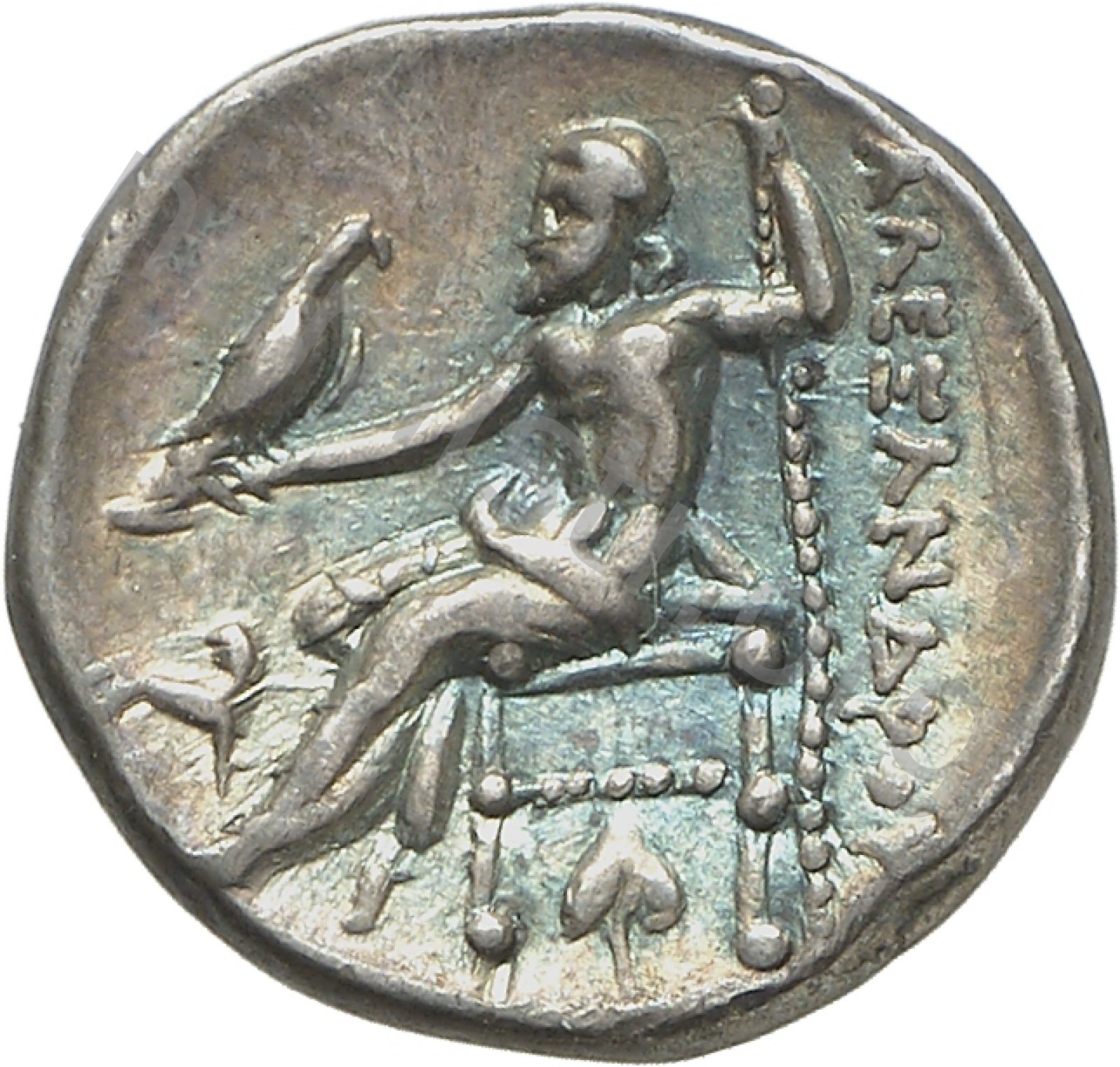 Zeus seated on stool-throne left eagle on outstretched right hand sceptre in left hand -[en]