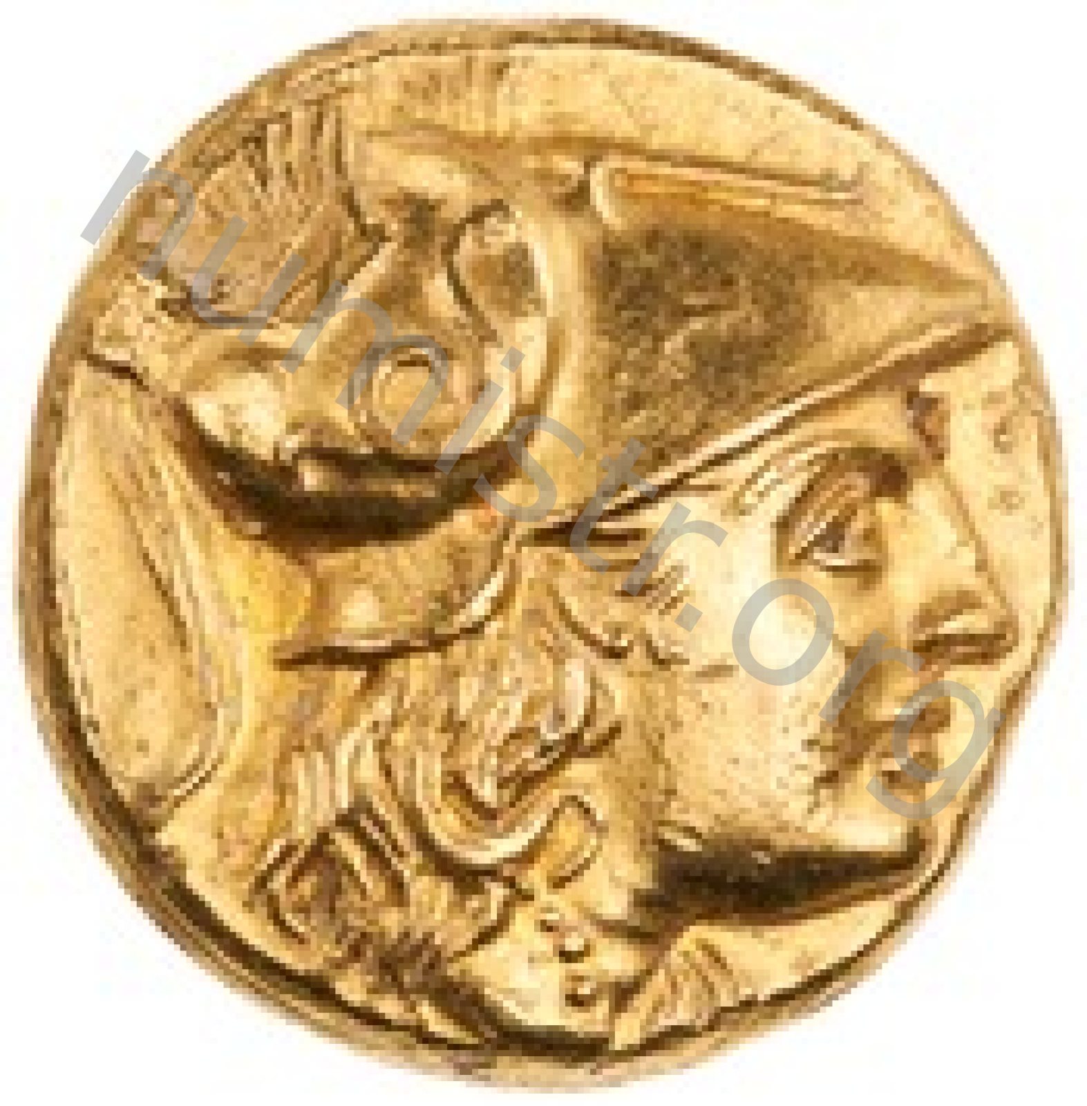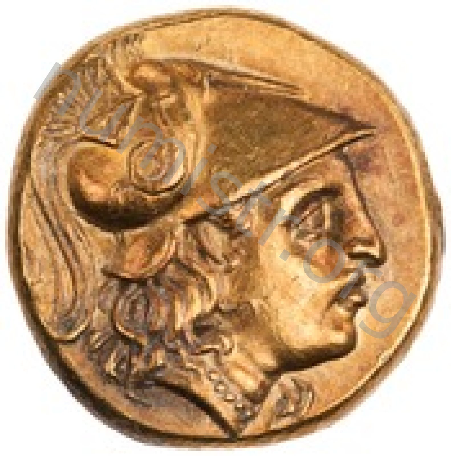 Head of Athena right wearing Corinthian helmet with crest -[en]
