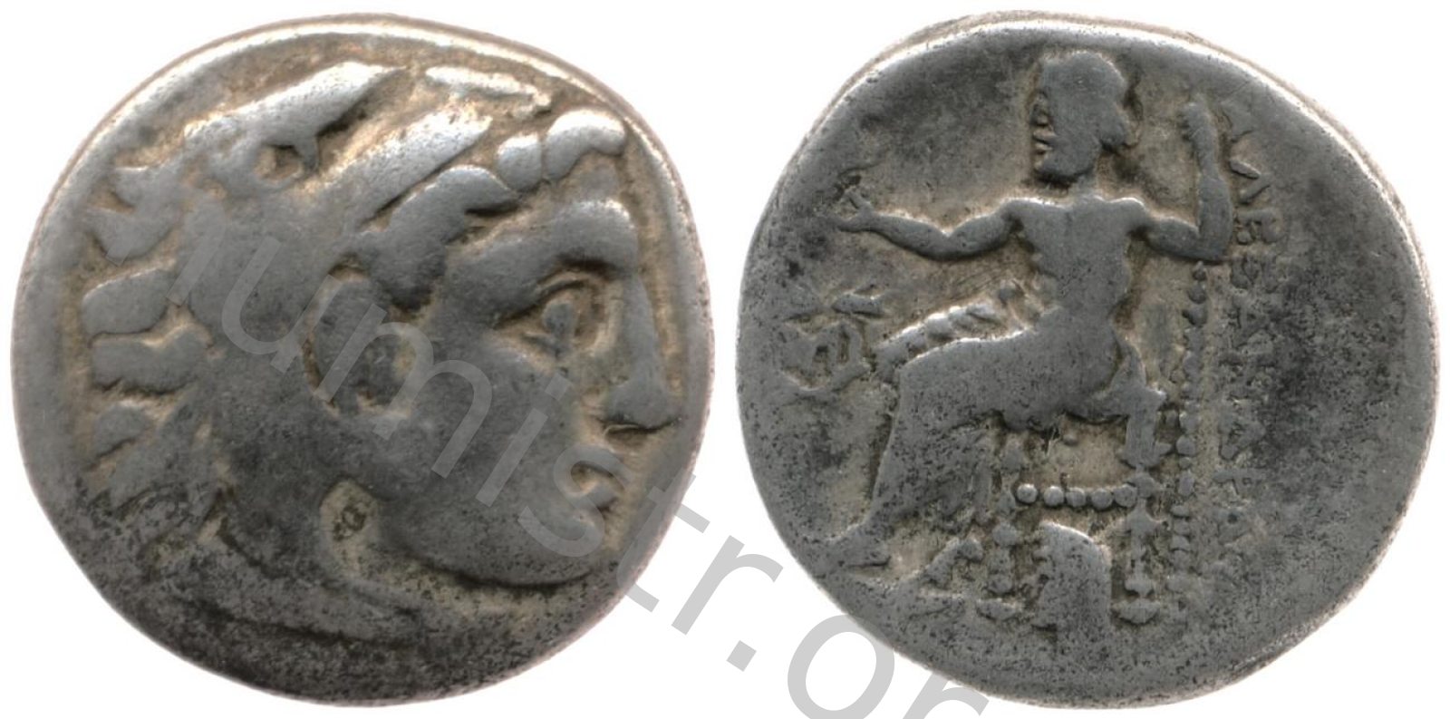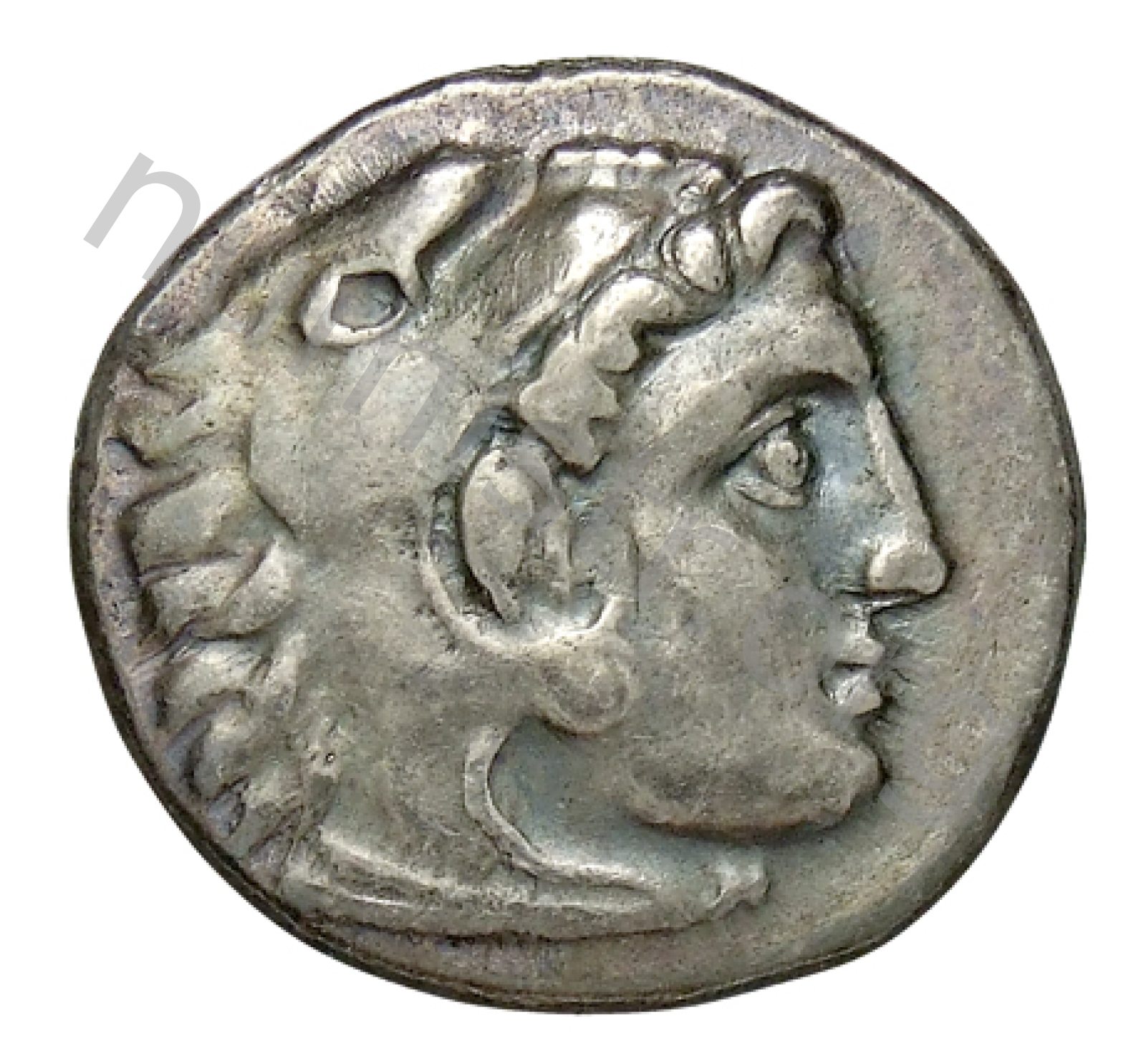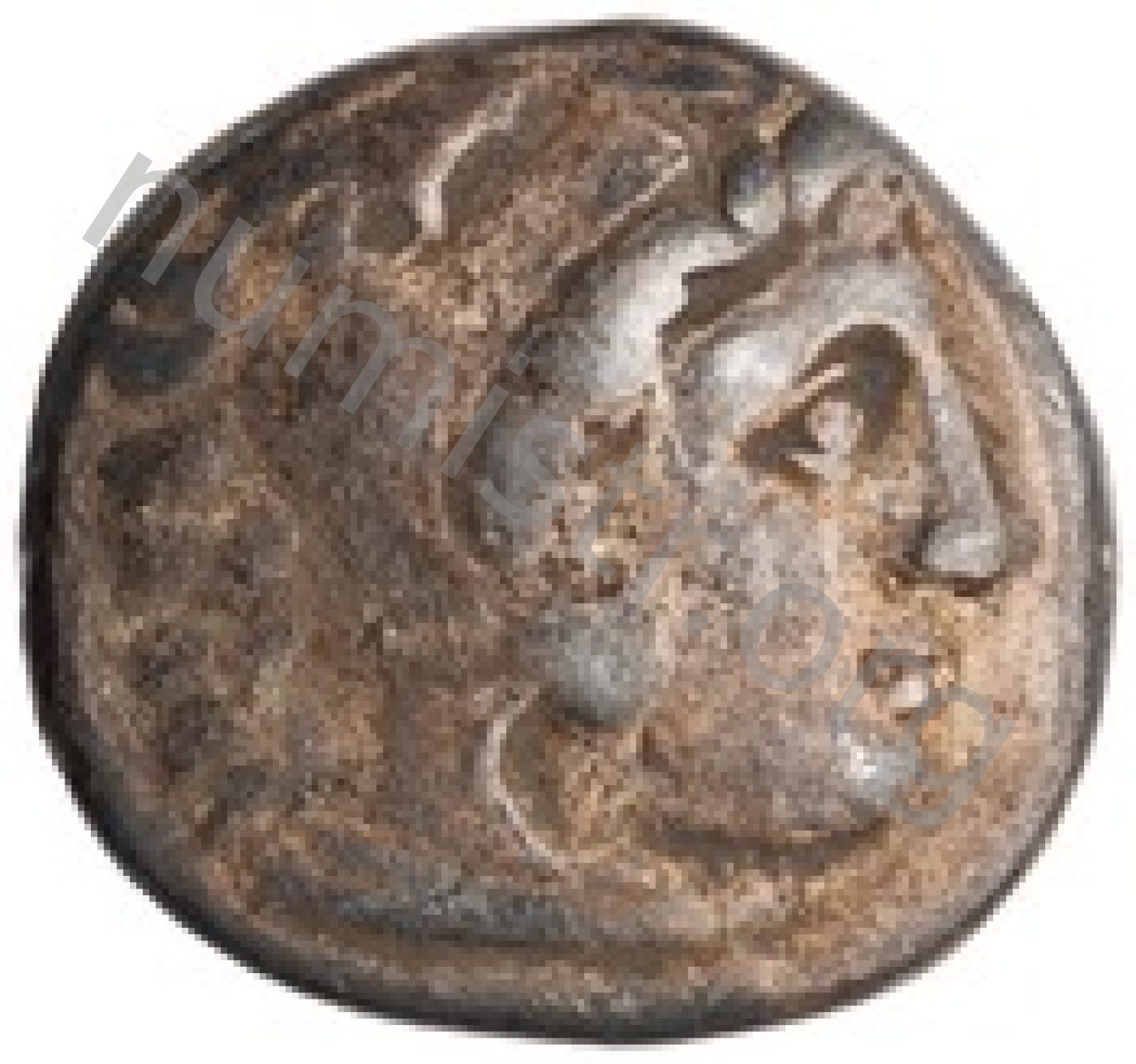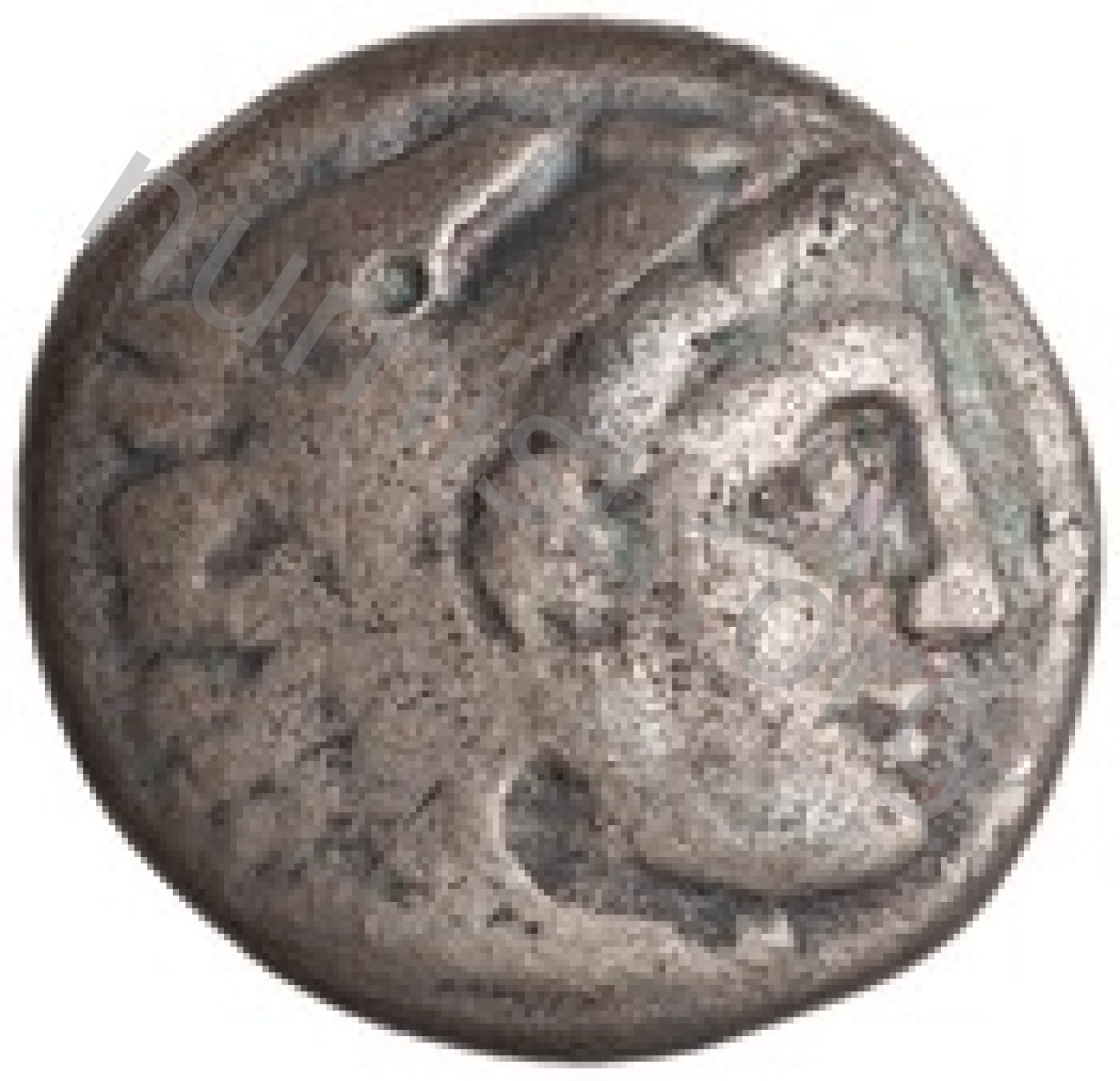 Head of beardless Heracles right wearing lion skin headdress -[en]