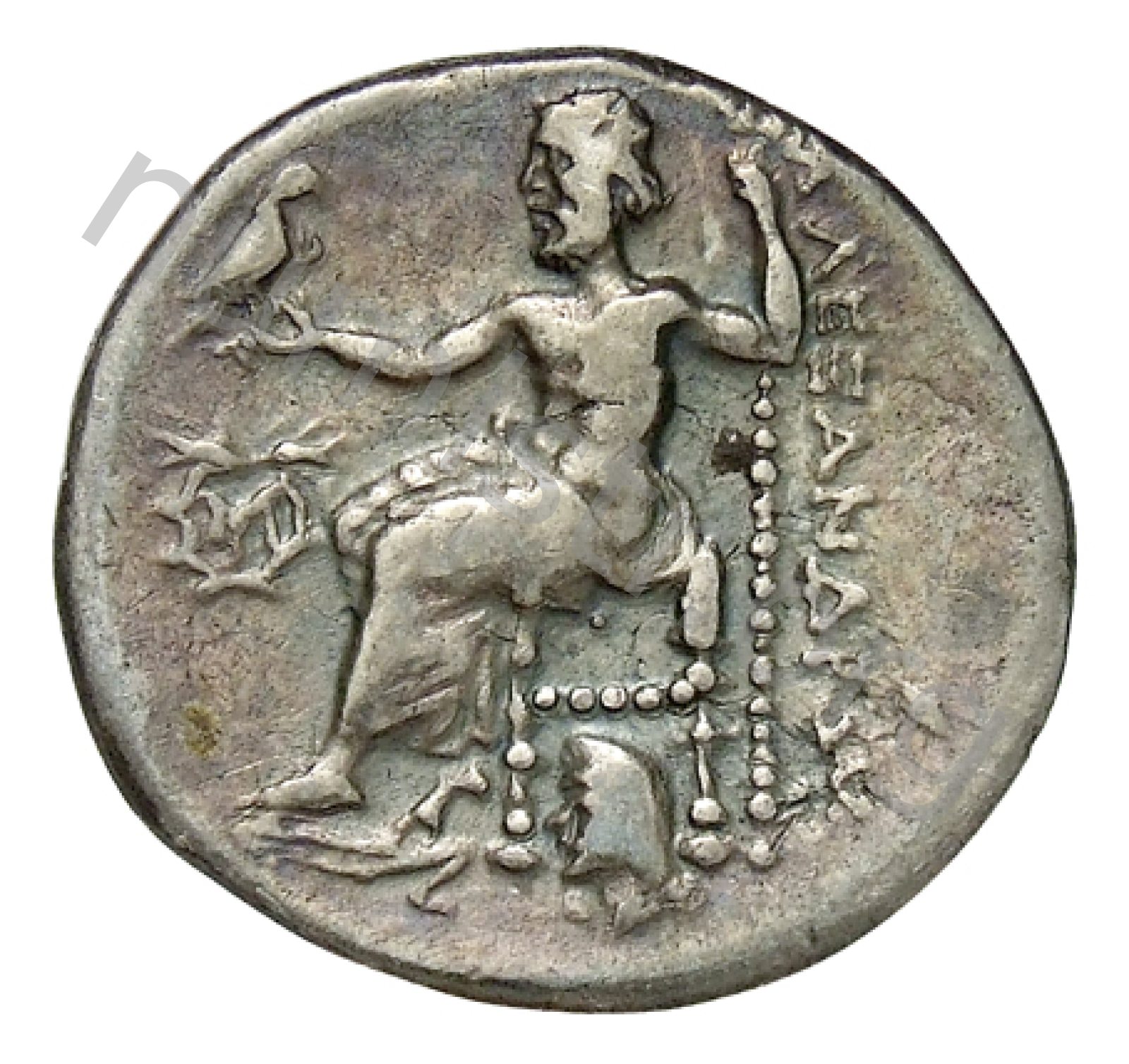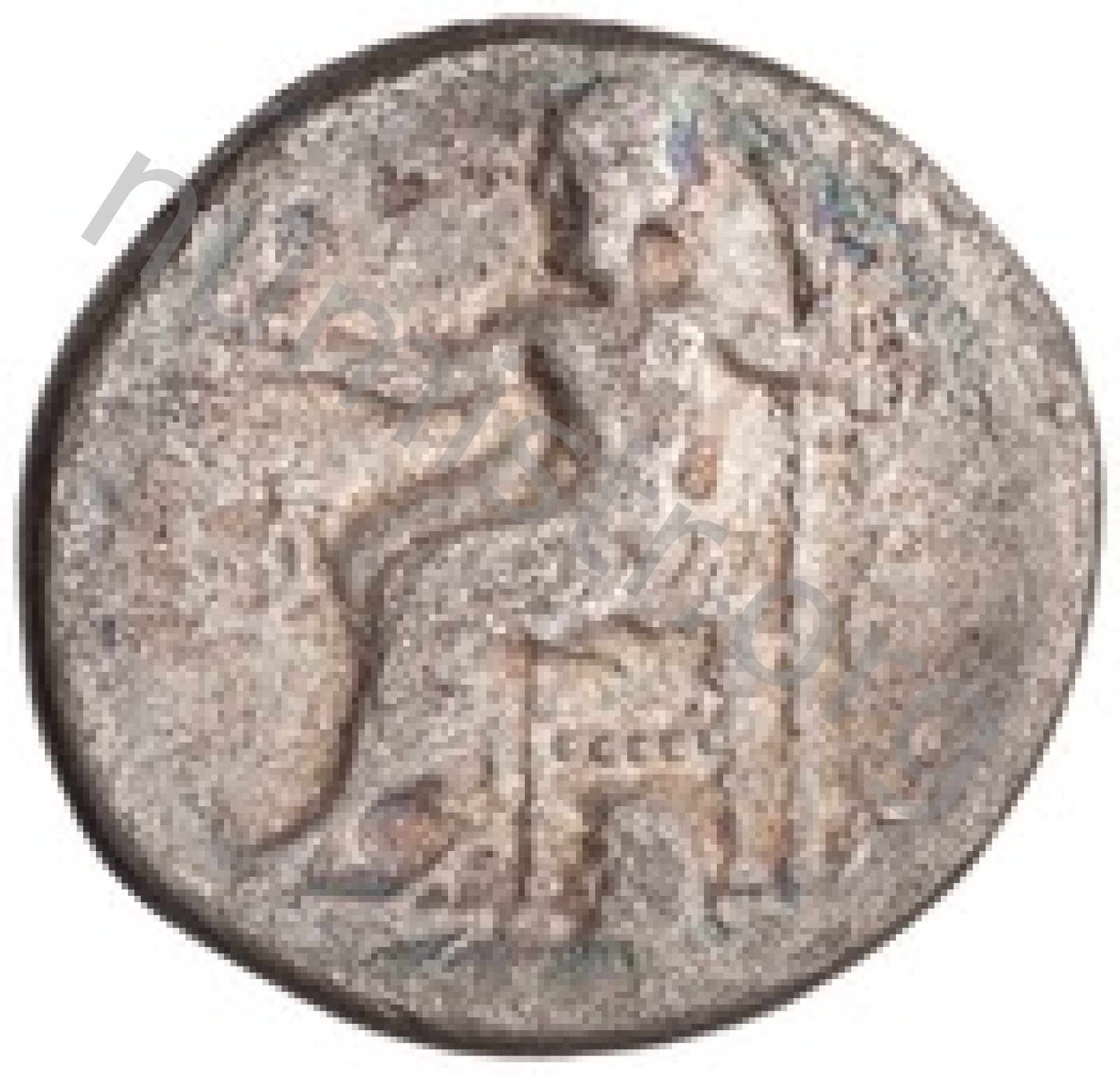 Zeus tabure-tahtta oturuyor sol elinde kartal sağ elinde asa var.