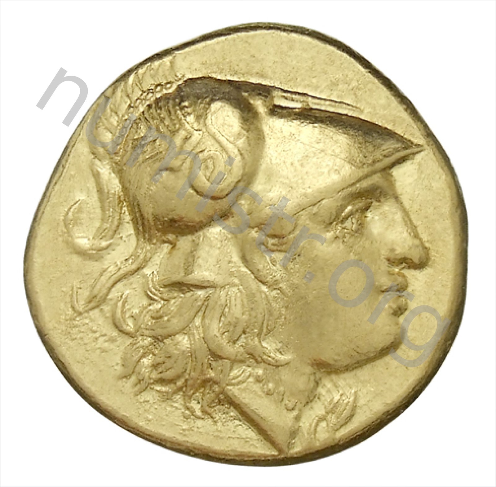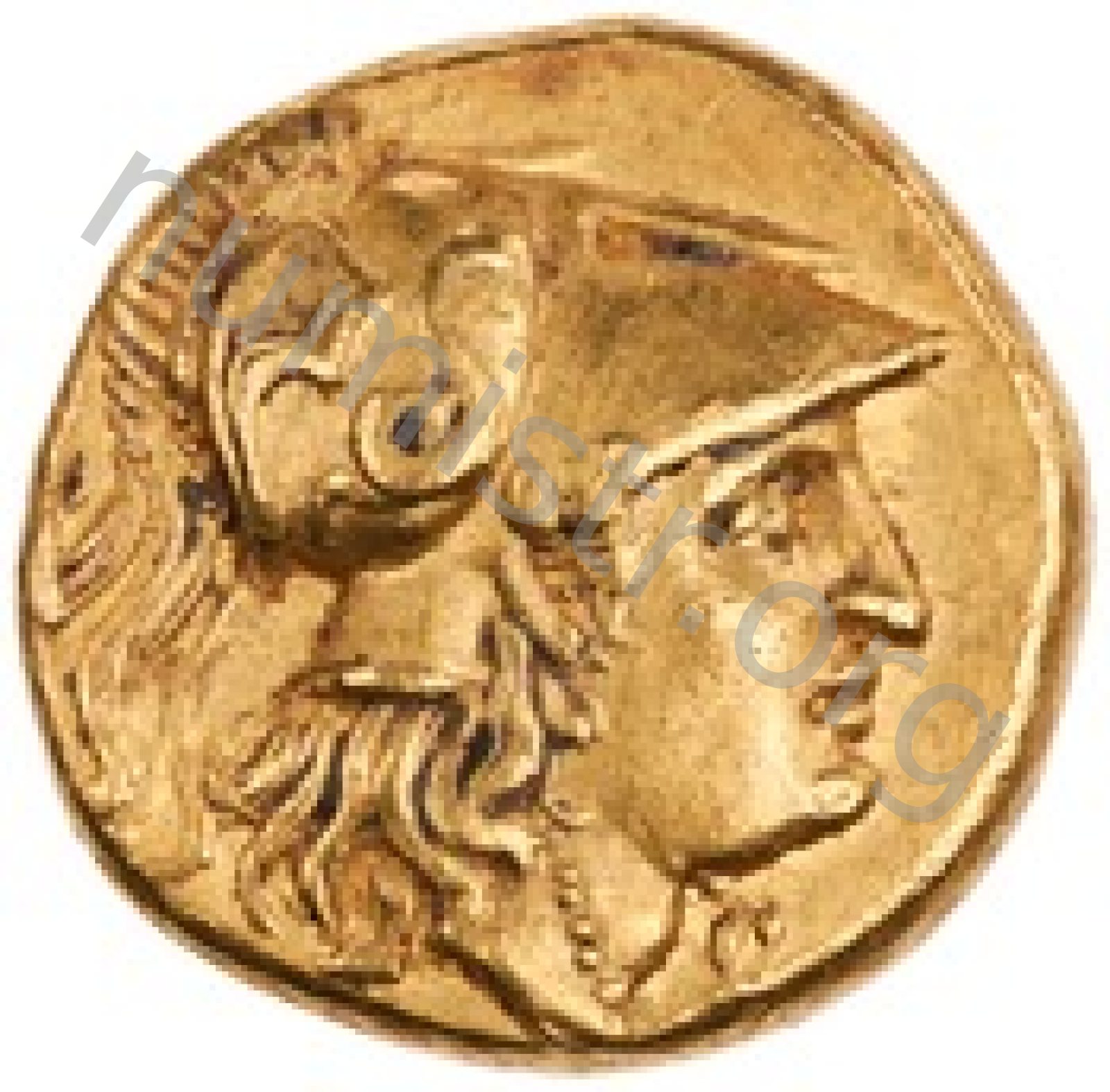 Head of Athena right wearing Corinthian helmet with crest -[en]