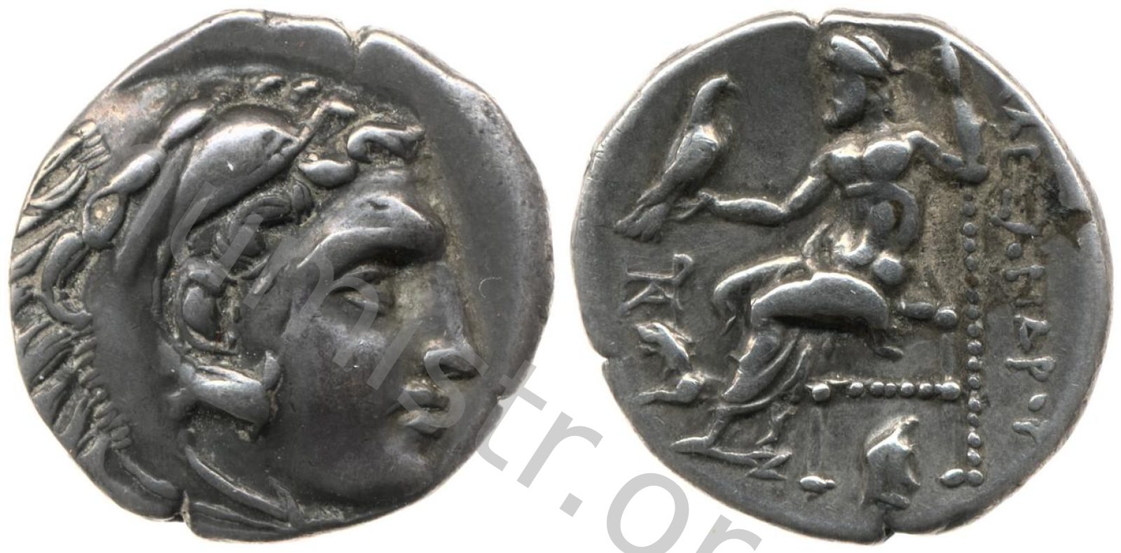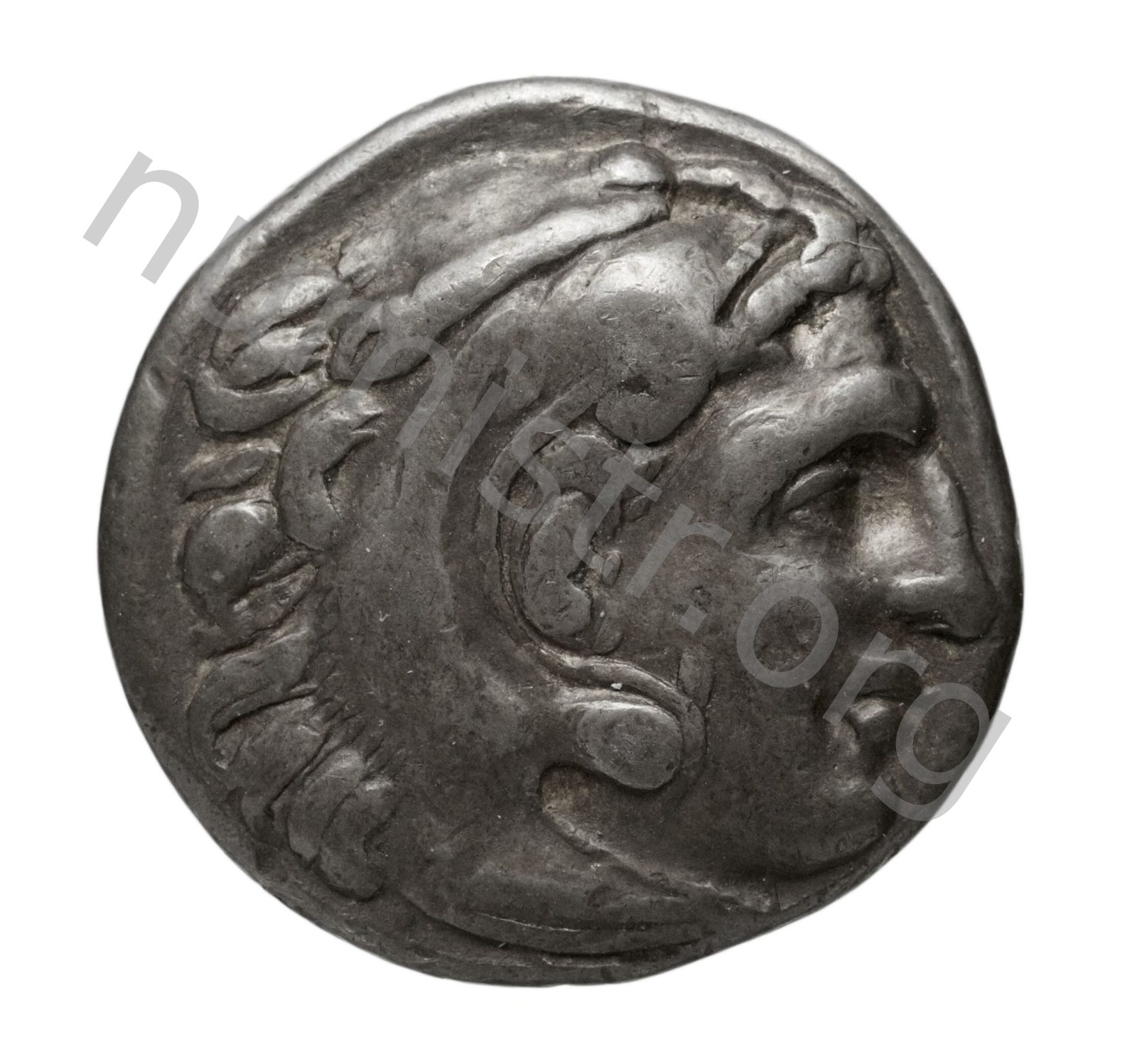 Head of beardless Heracles right wearing lion skin headdress -[en]