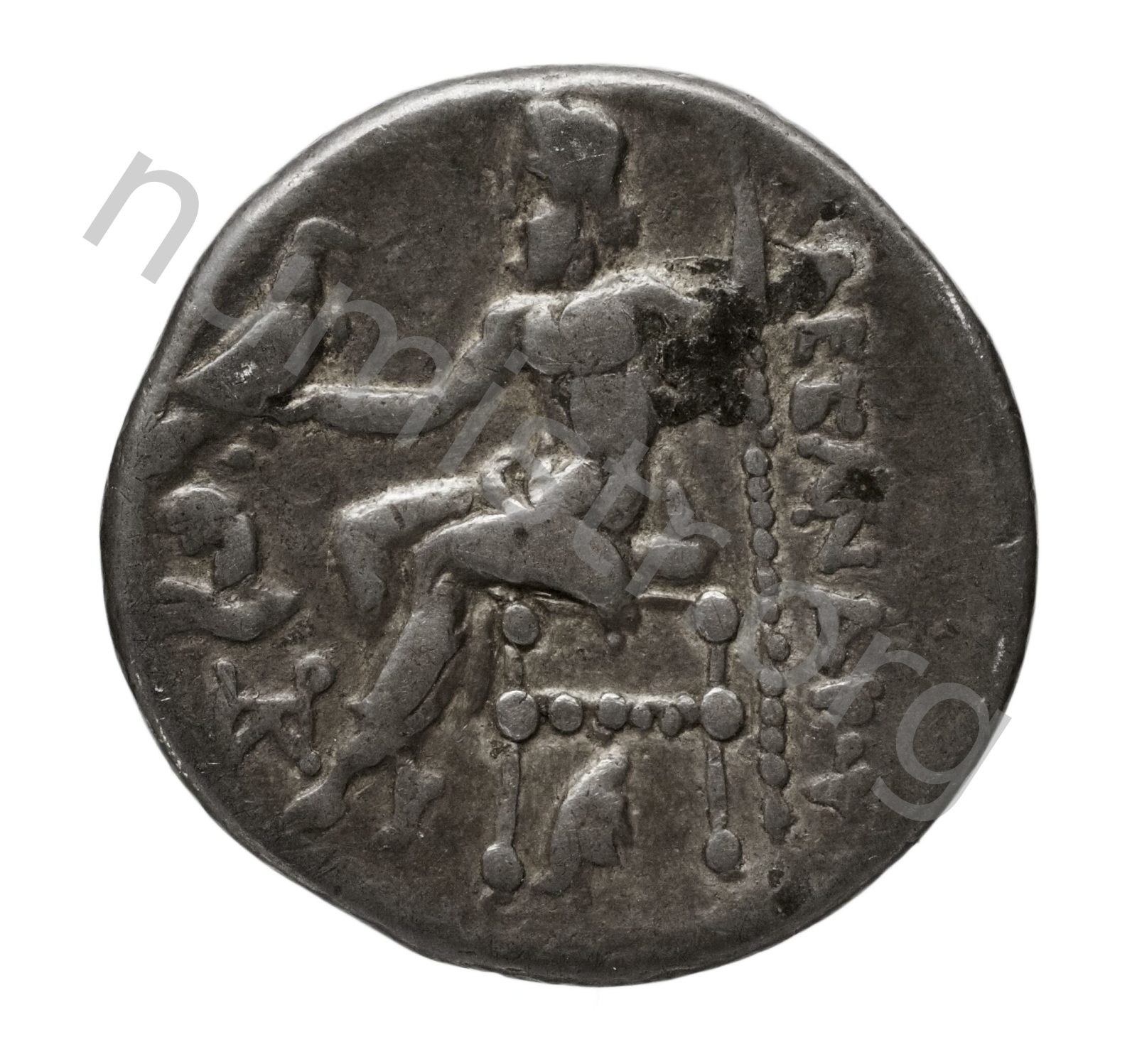 Zeus seated on stool-throne left eagle on outstretched right hand sceptre in left hand -[en]