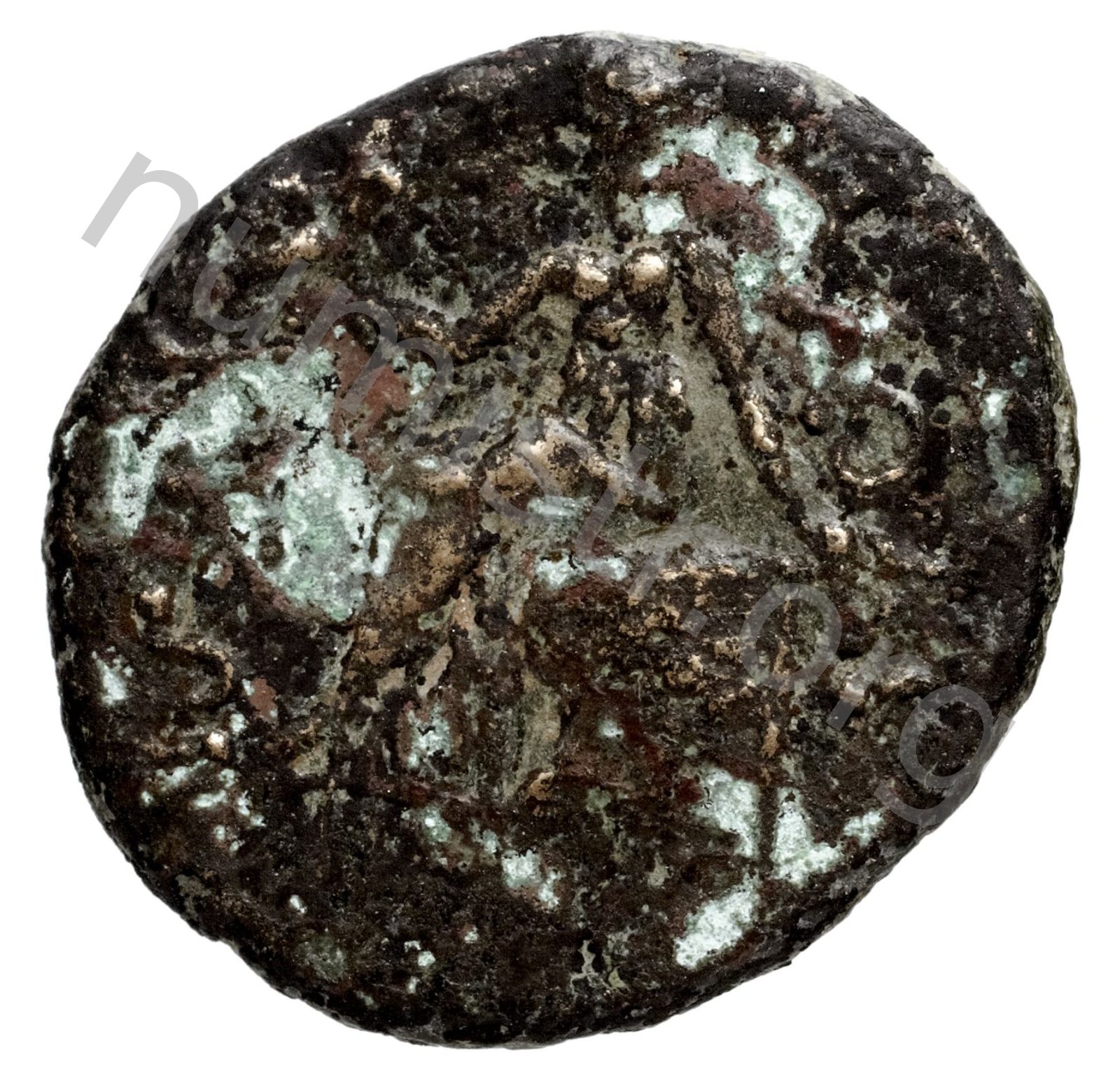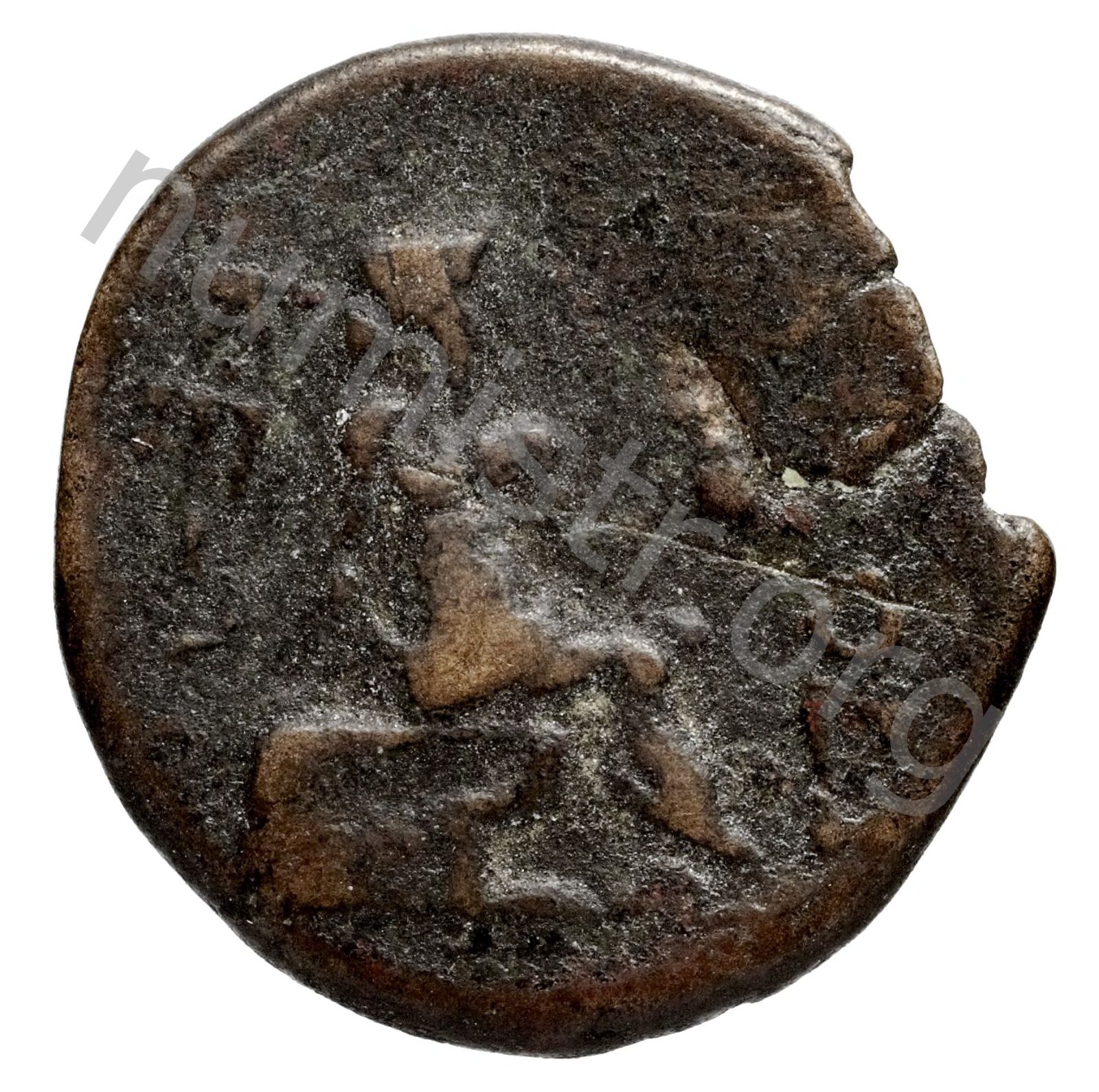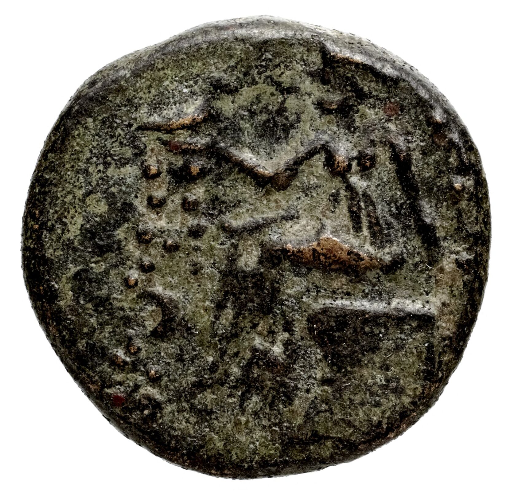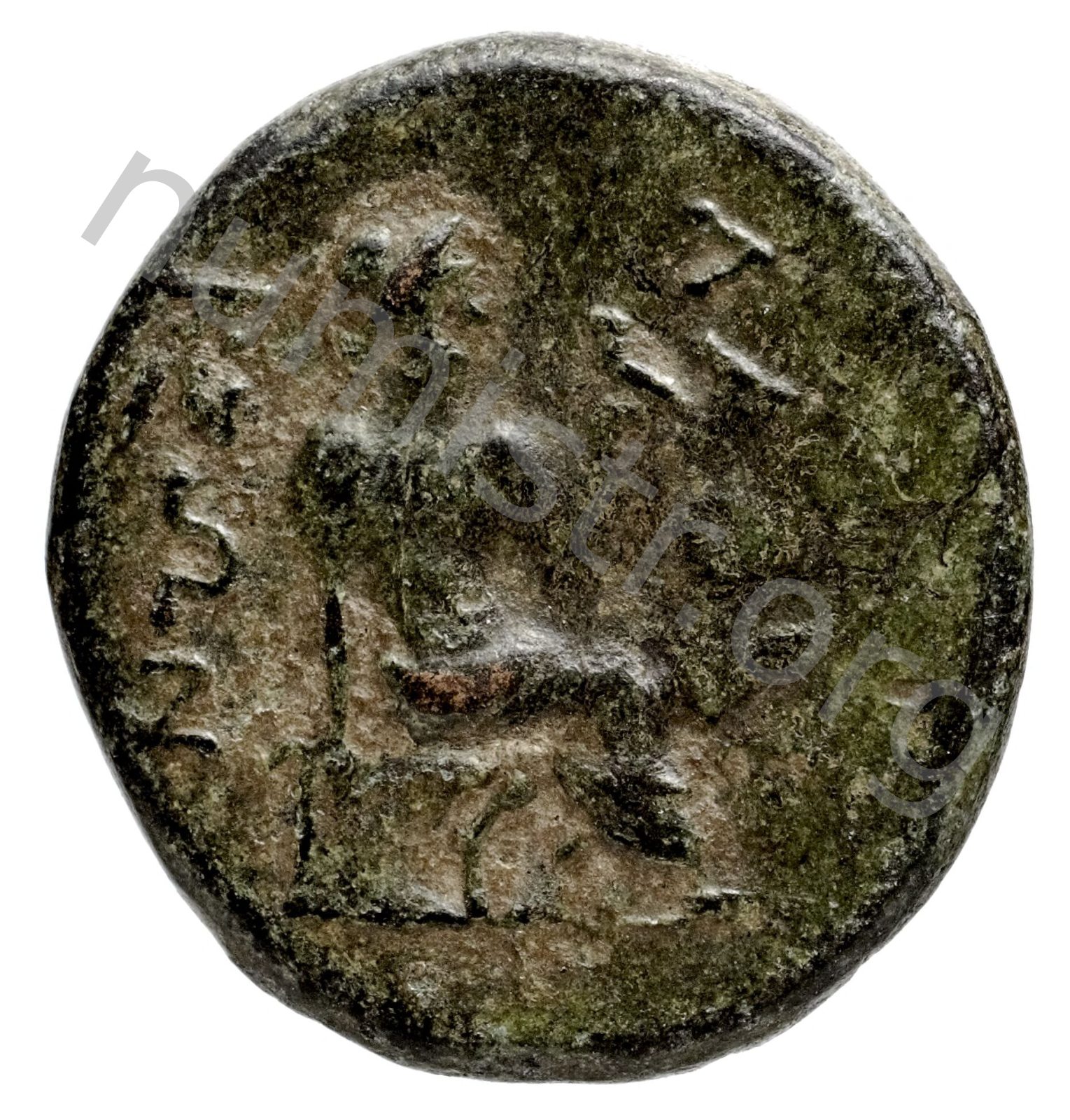 Aphrodite seated on a backless throne breast bare dressed in peplos on her legs holding a dove -[en]