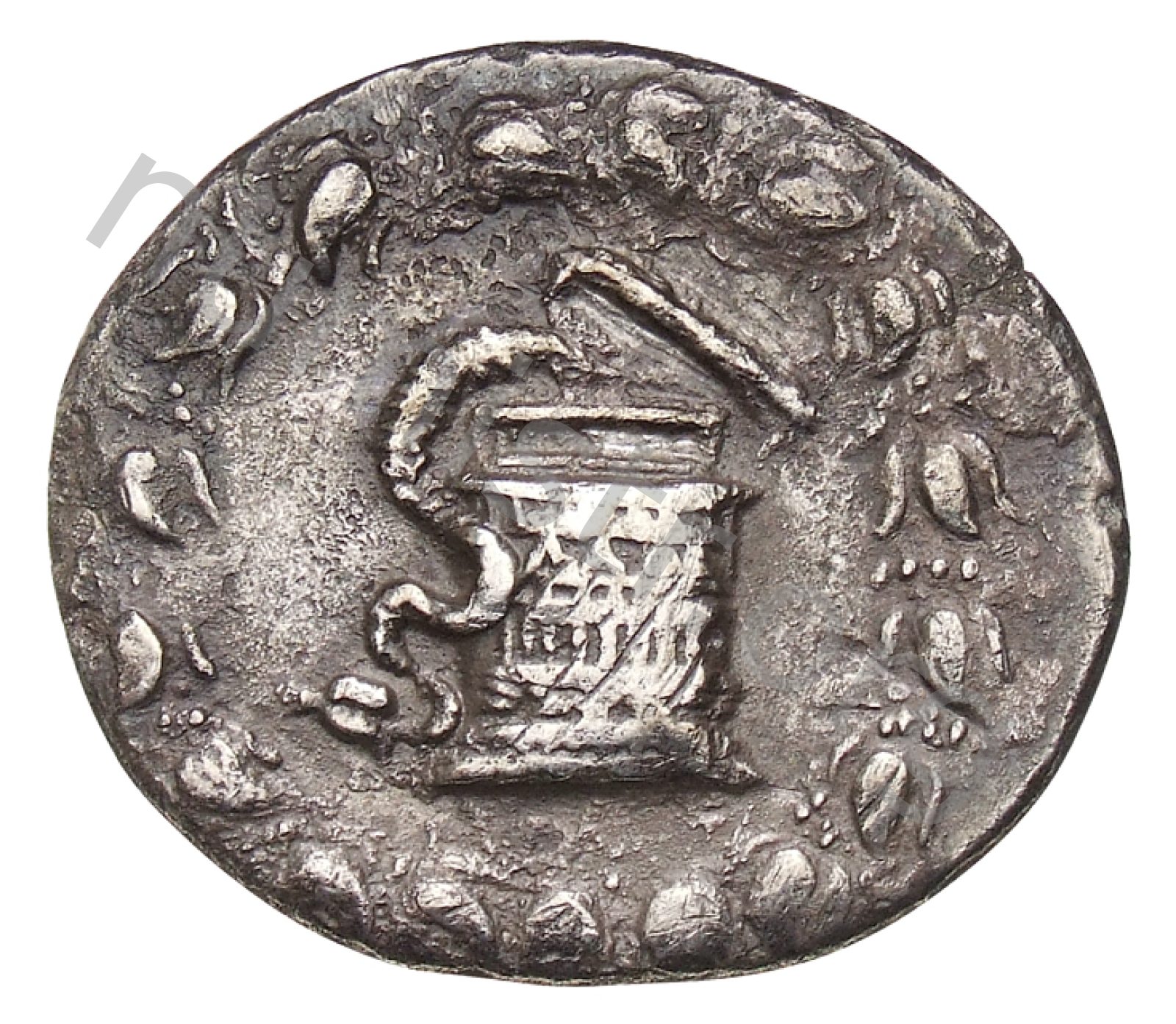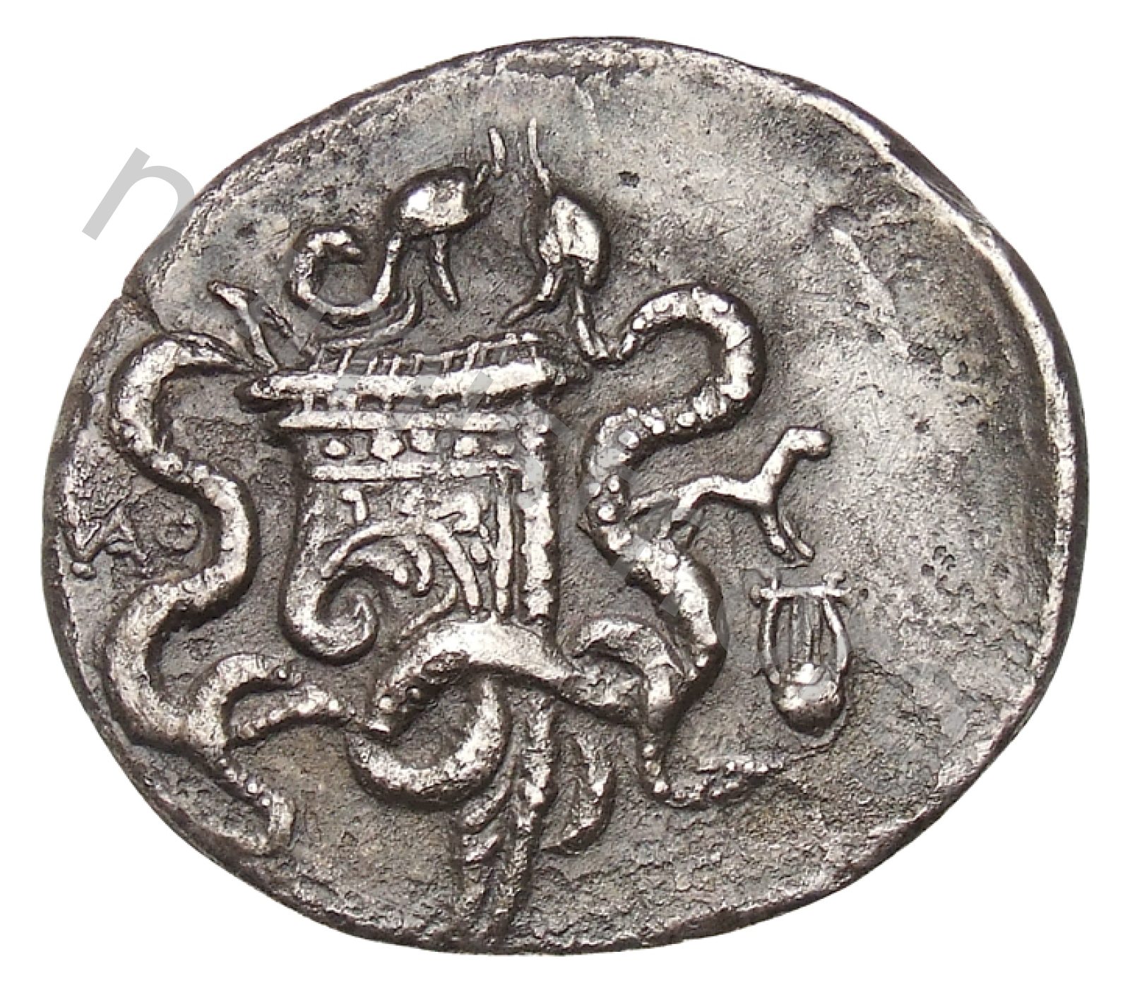 Gorytos (yay kılıfı) bir aplustre ile süslenmiş ve iki iç içe geçmiş yılanın arasında bir yay bulunan; iki yanında kurt ve lir bulunan