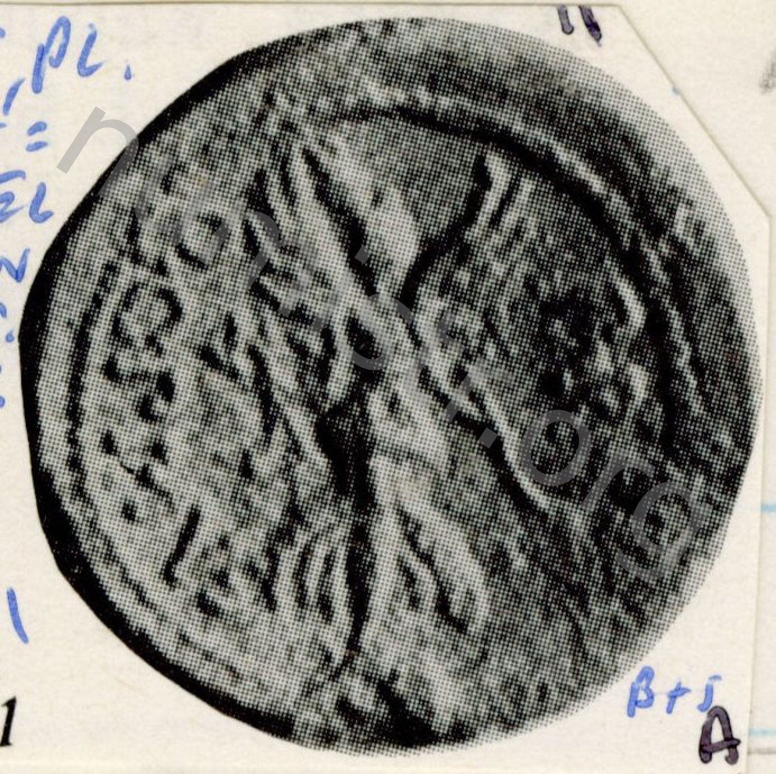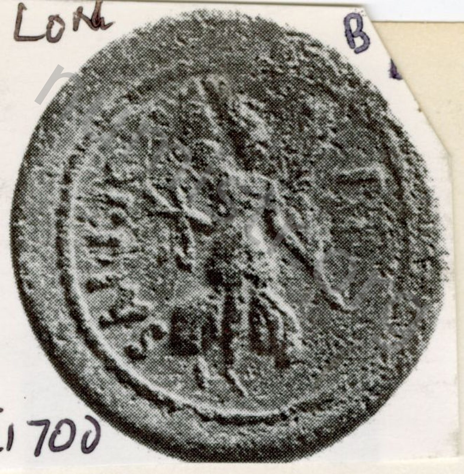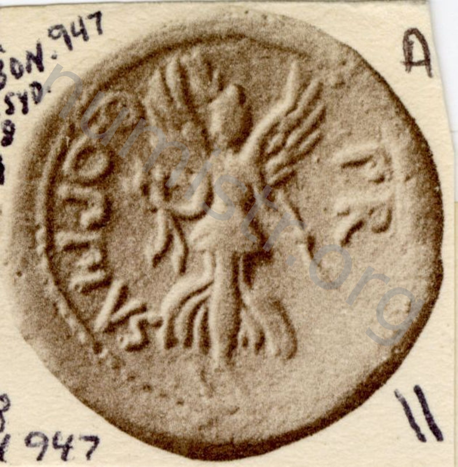 Sağ elinde çelenk sol elinde palmiye dalı tutan zafer figürü. Kenarı noktalarla çevrili.