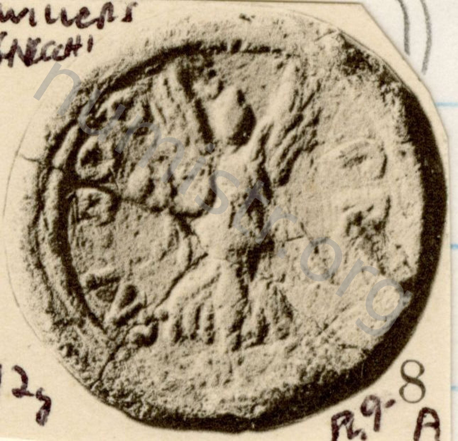 Victory facing holding wreath in right hand and palm-branch in left hand. Border of dots. -[en]