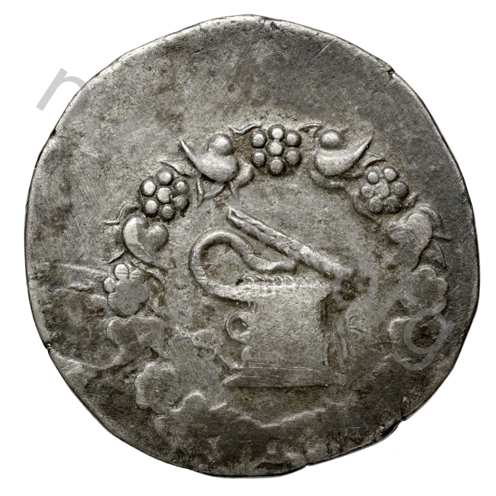 Basket (cista mystica) from which a snake emerges in a wreath of ivy -[en]