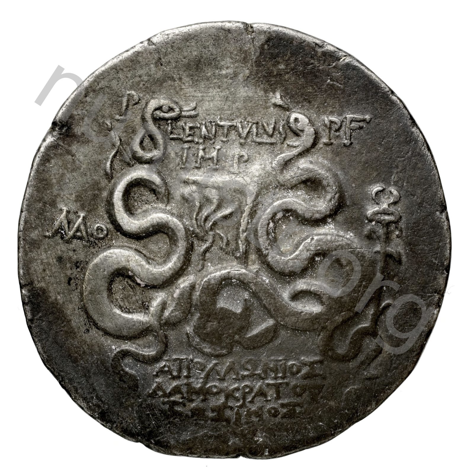 Gorytos (yay kılıfı) bir aplustre ile süslenmiş ve iki iç içe geçmiş yılan arasında bir yay bulunan; yanda kanatlı caduceus