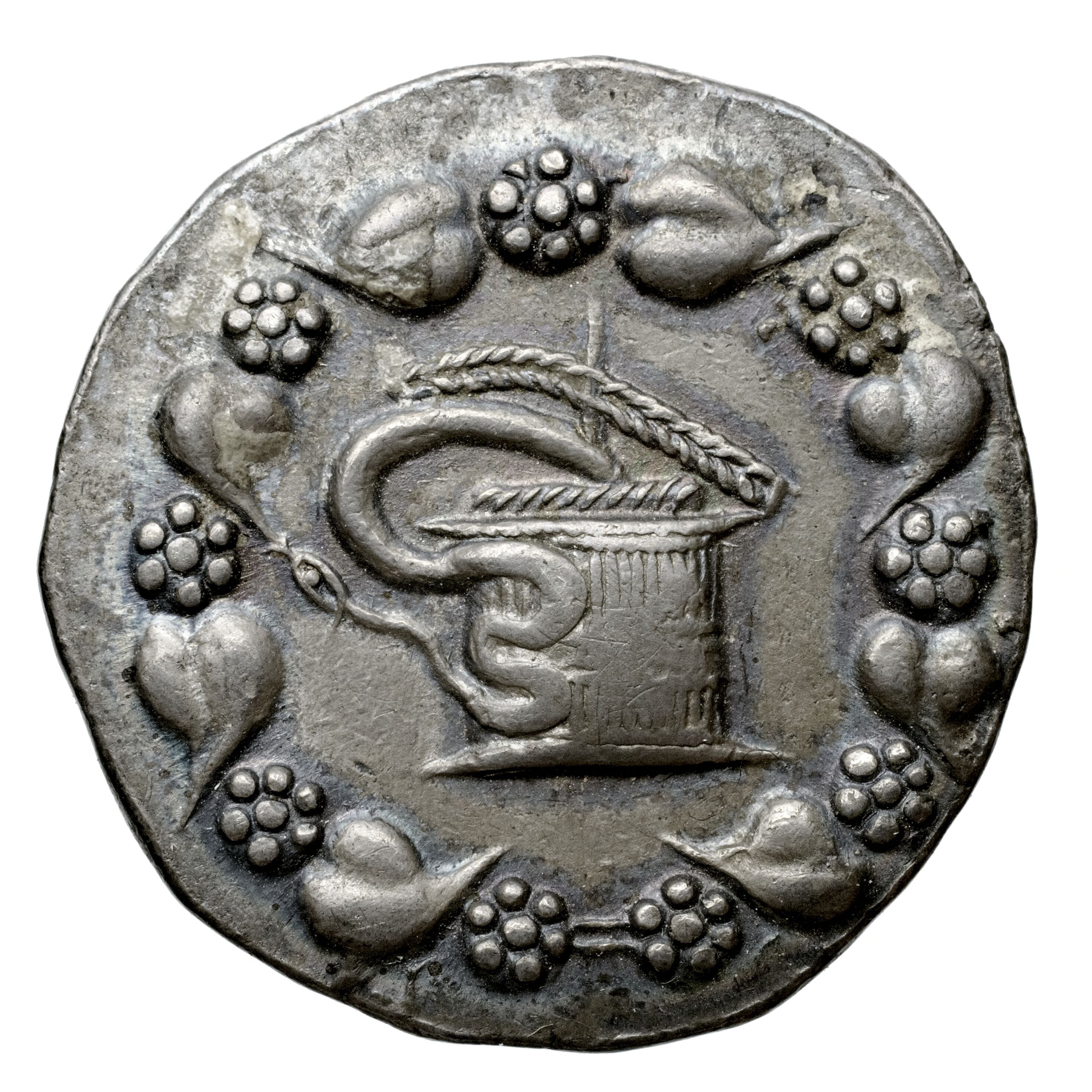 Basket (cista mystica) from which a snake emerges in a wreath of ivy -[en]