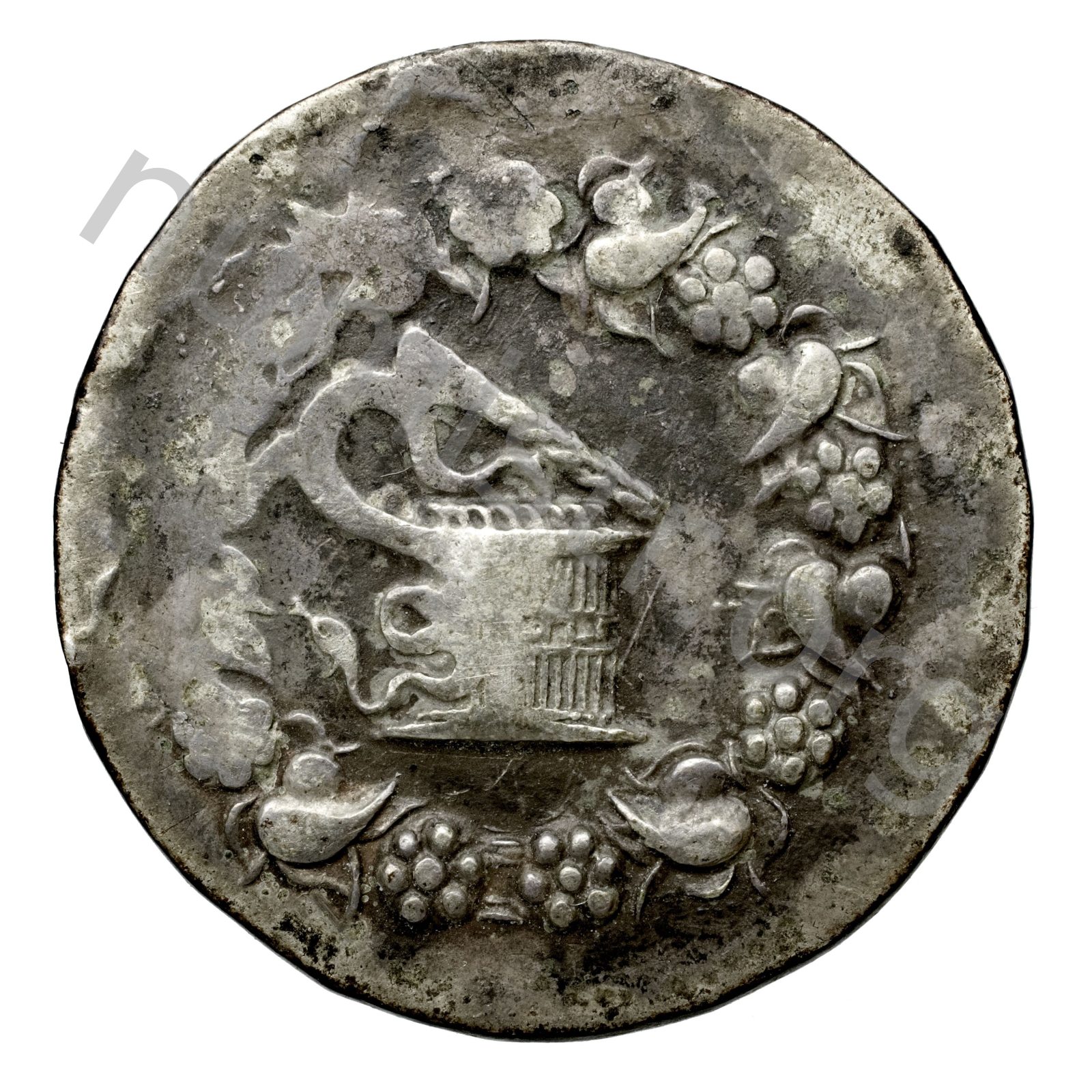 Basket (cista mystica) from which a snake emerges in a wreath of ivy -[en]