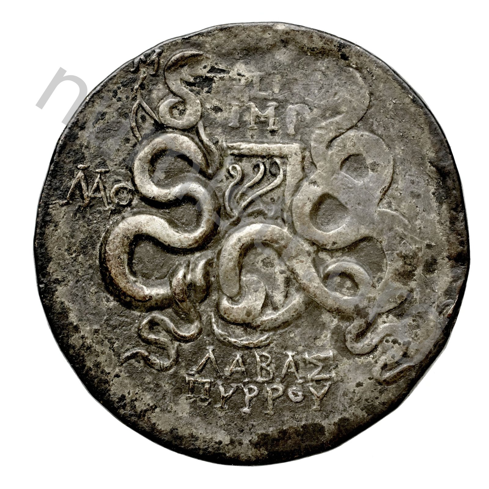 Gorytos (bow case) decorated with an aplustre and containing a bow between two intertwined snakes; to side winged caduceus -[en]