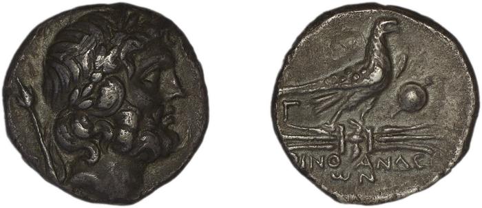 Head of Zeus wearing a laurel wreath; behind lotus-tipped sceptre -[en]