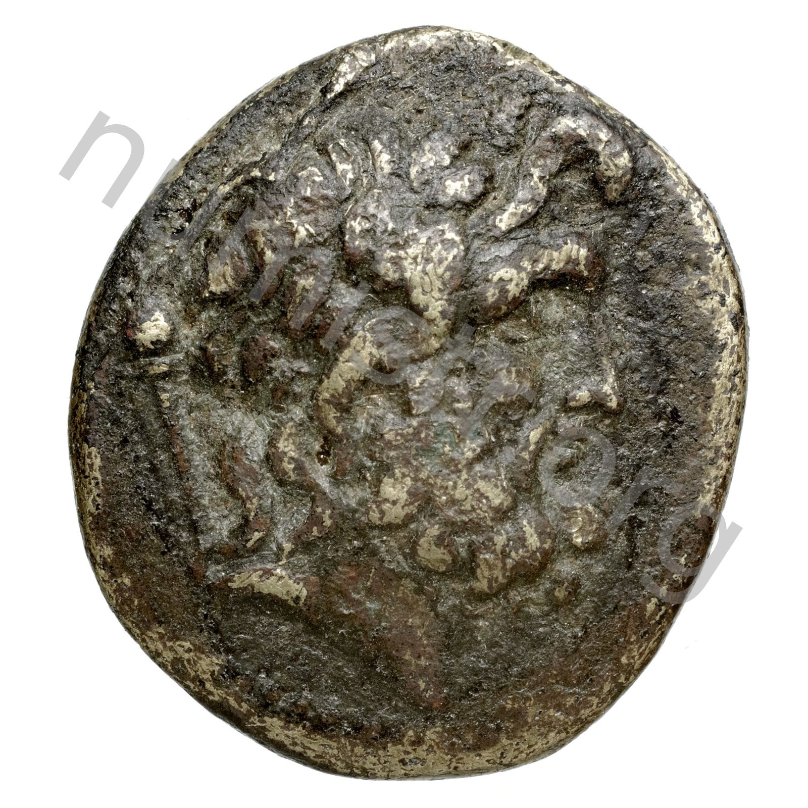 Head of Zeus bearded wearing a laurel wreath; in field sceptre -[en]