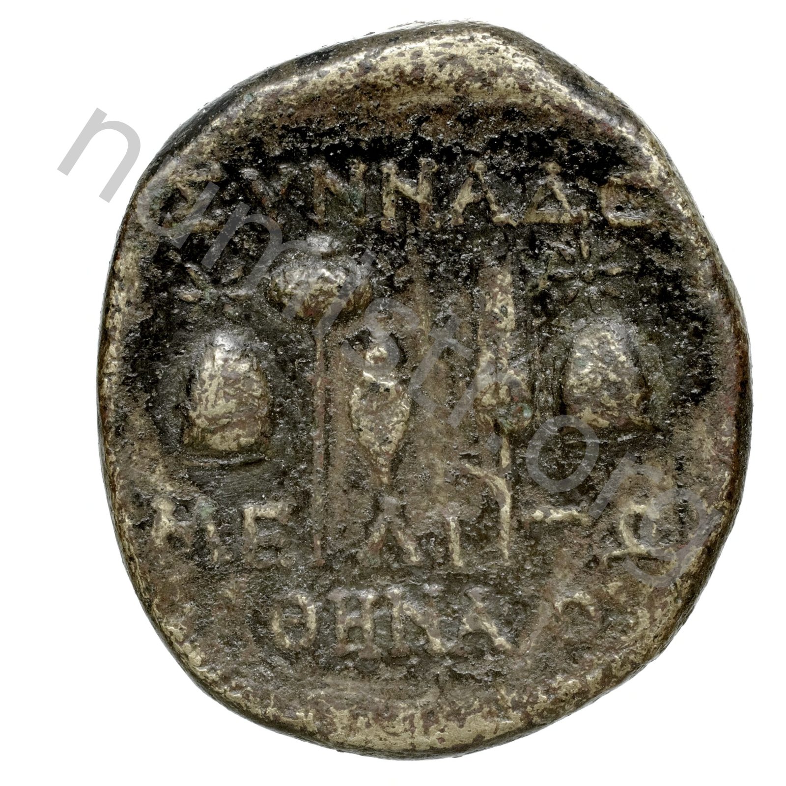 Pilei (caps of the Dioscuri) topped with stars; between them a poppy head and two ears of grain -[en]