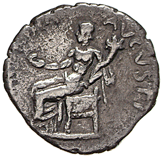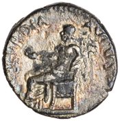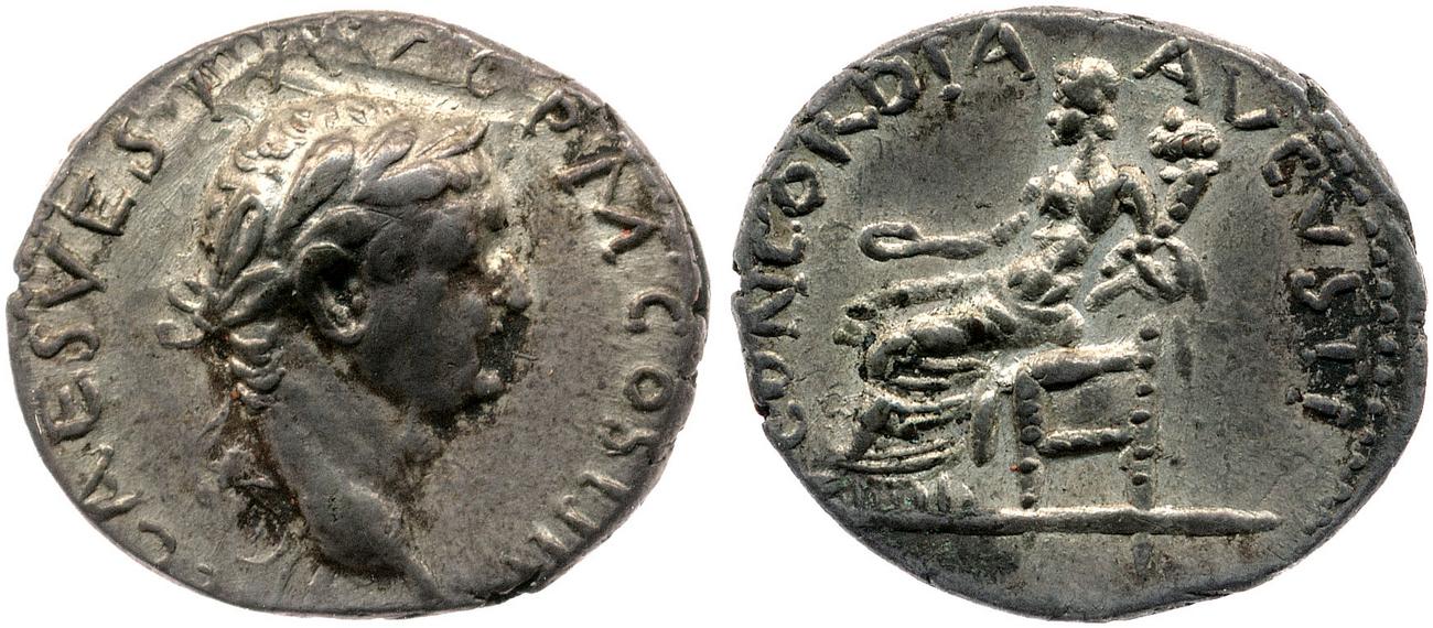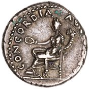 Concordia örtülü bir şekilde sol elinde patera sol elinde bereket boynuzu tutarak oturuyor