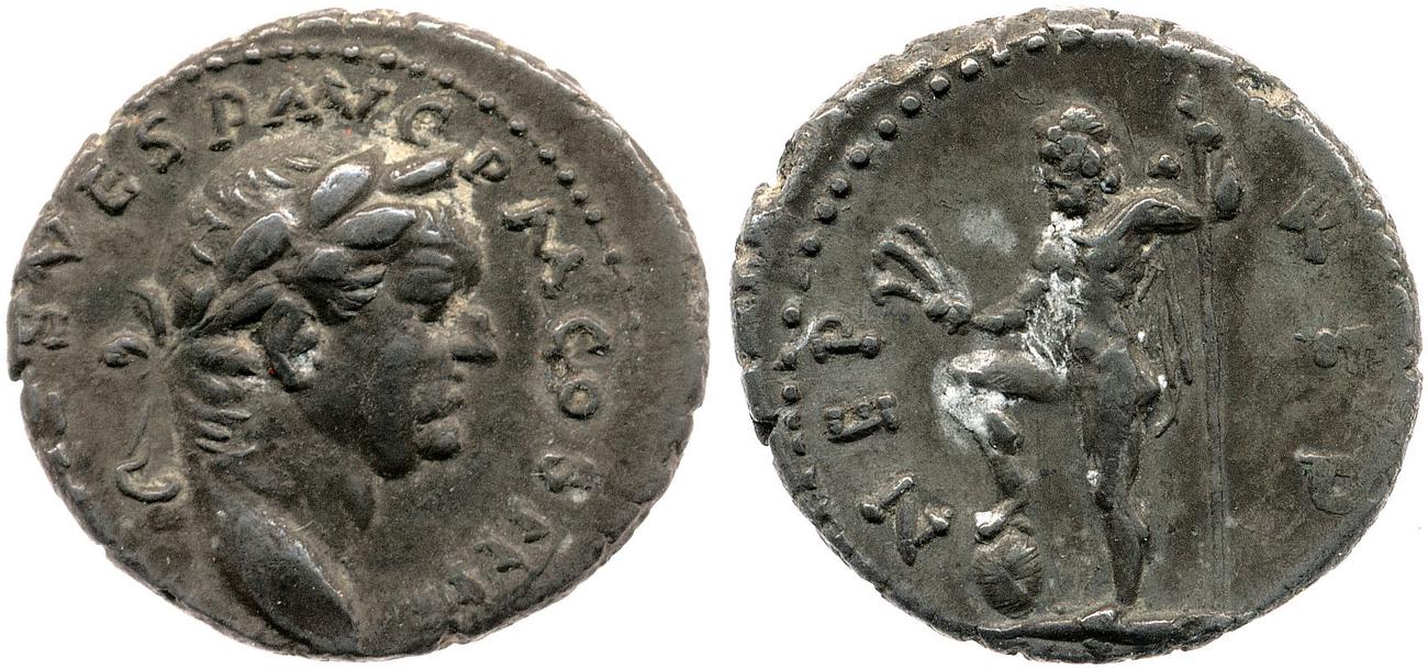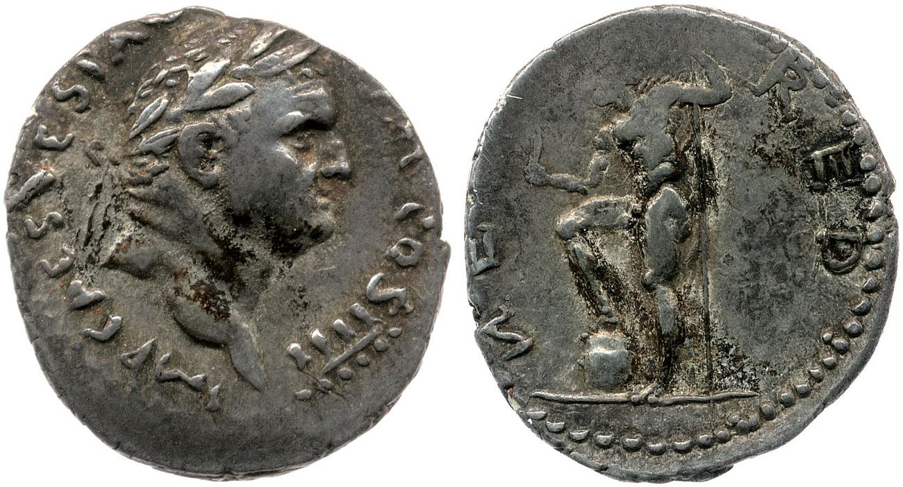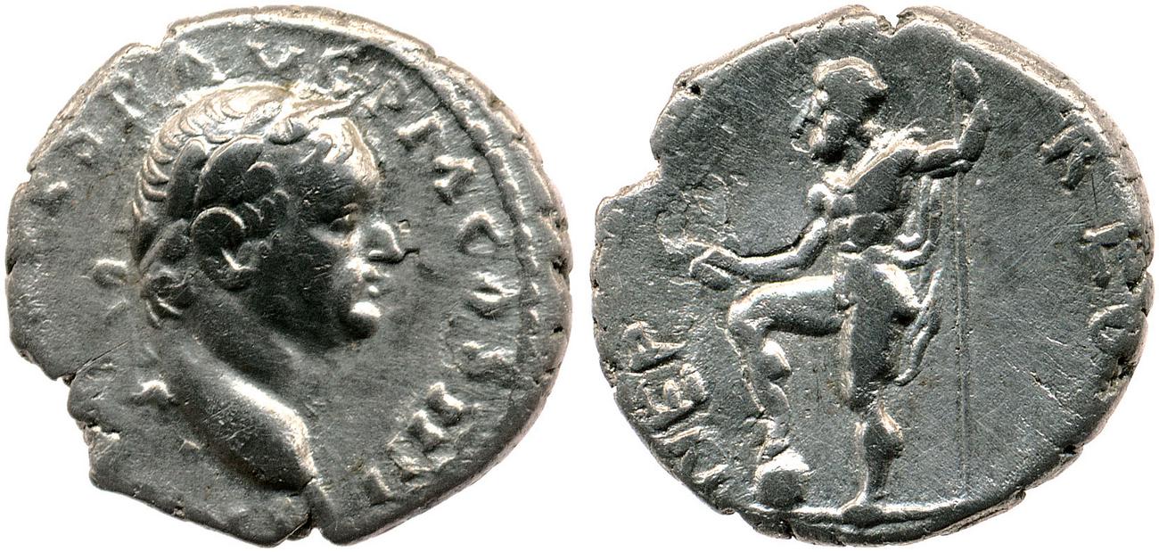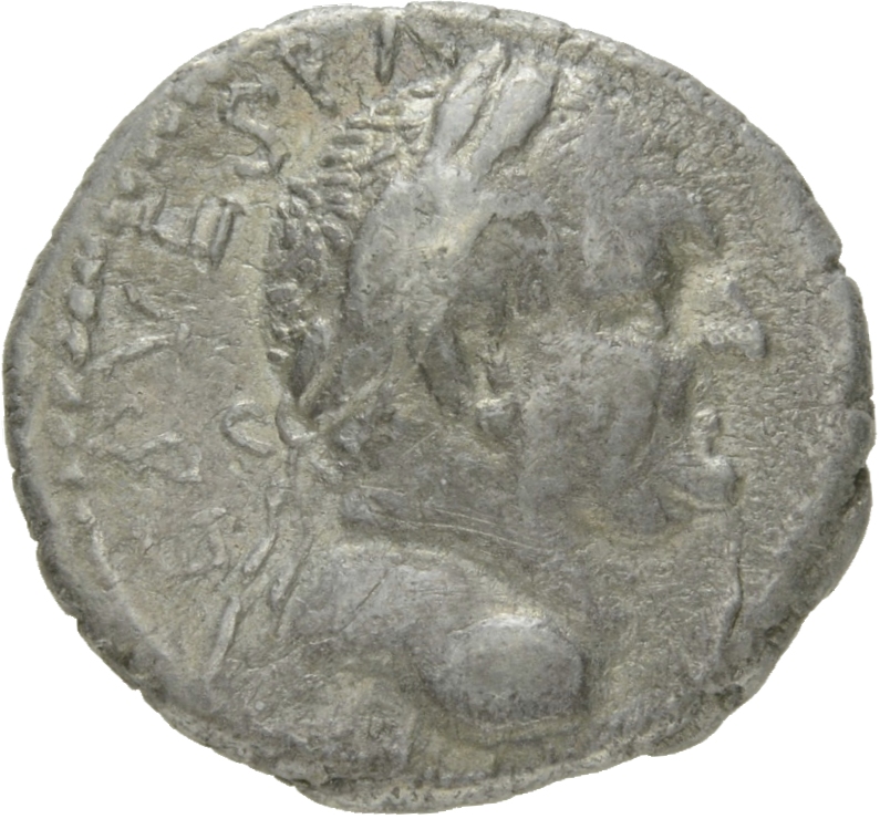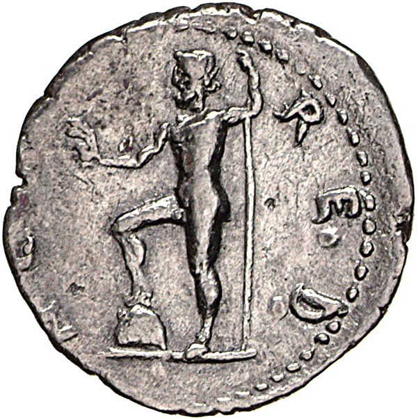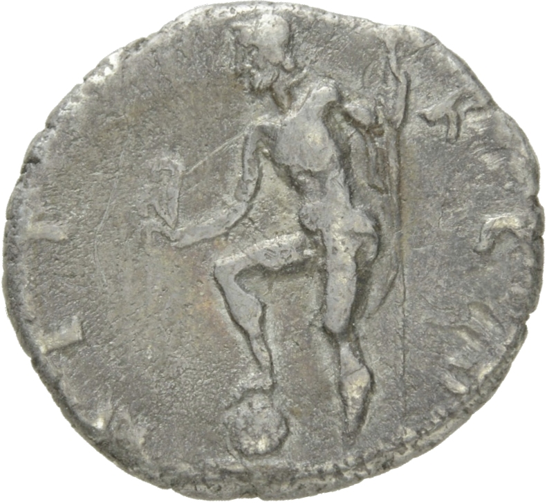 Neptune standing left resting right foot on globe holding acrostolium and sceptre -[en]