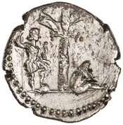 Judaea veiled draped seated right under palm-tree in attitude of mourning; behind palm Vespasian in military dress standing right right foot on helmet holding vertical spear in right hand and parazonium in left -[en]