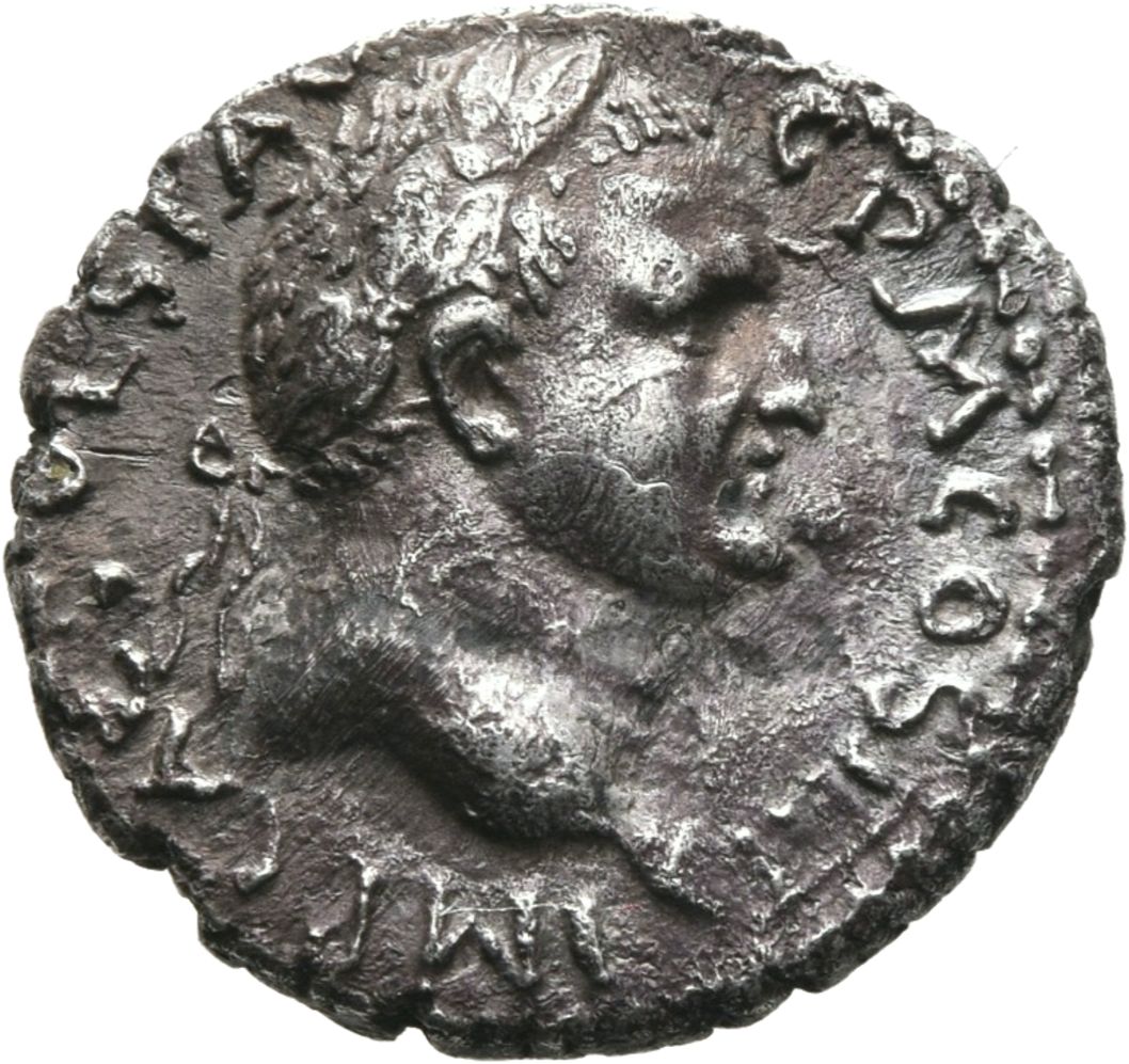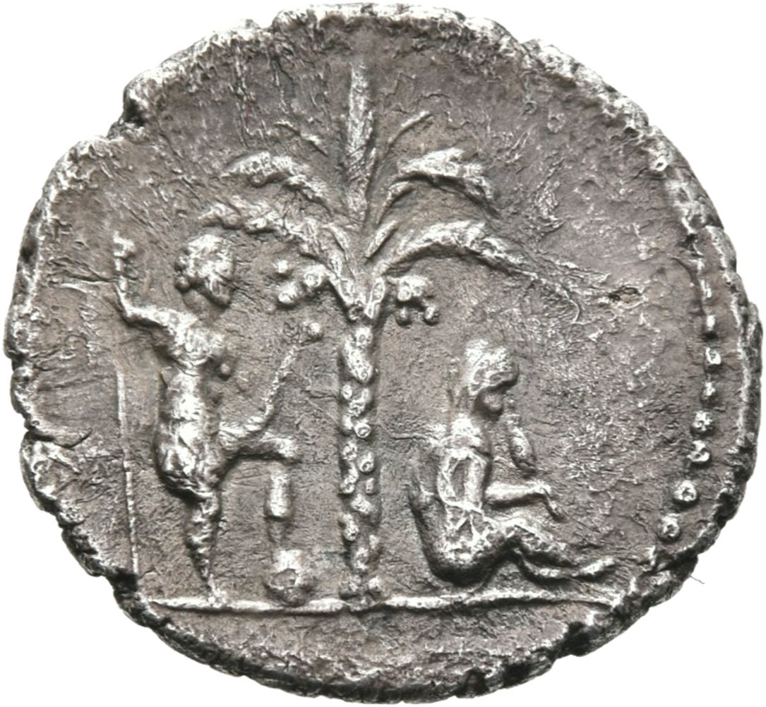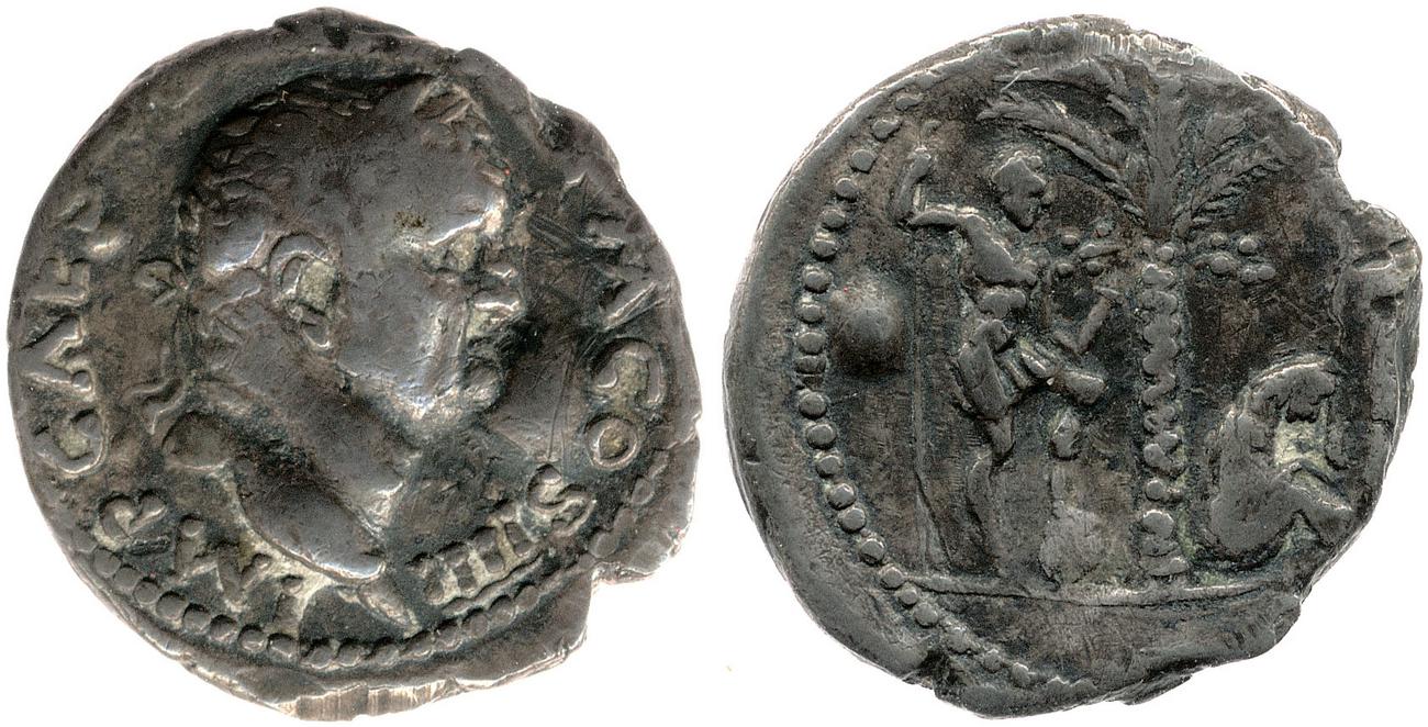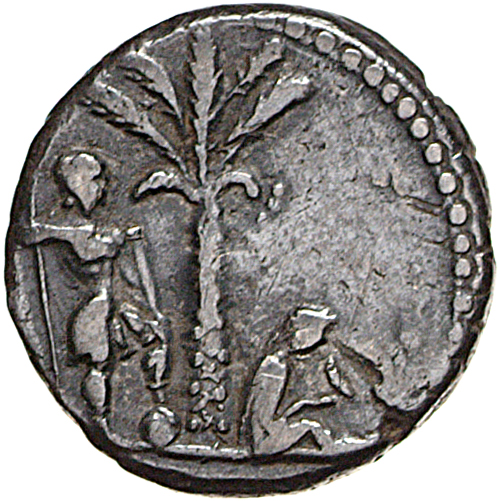 Yahudiye örtülü örtülü palmiye ağacının hemen altında oturmuş yas tutuyormuş gibi bir tavır takınmış; palmiye ağacının arkasında askeri kıyafetli Vespasianus ayakta sağ ayağında miğfer var sağ elinde dikey mızrak sol elinde parazonium tutuyor.