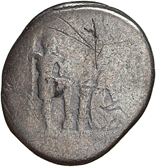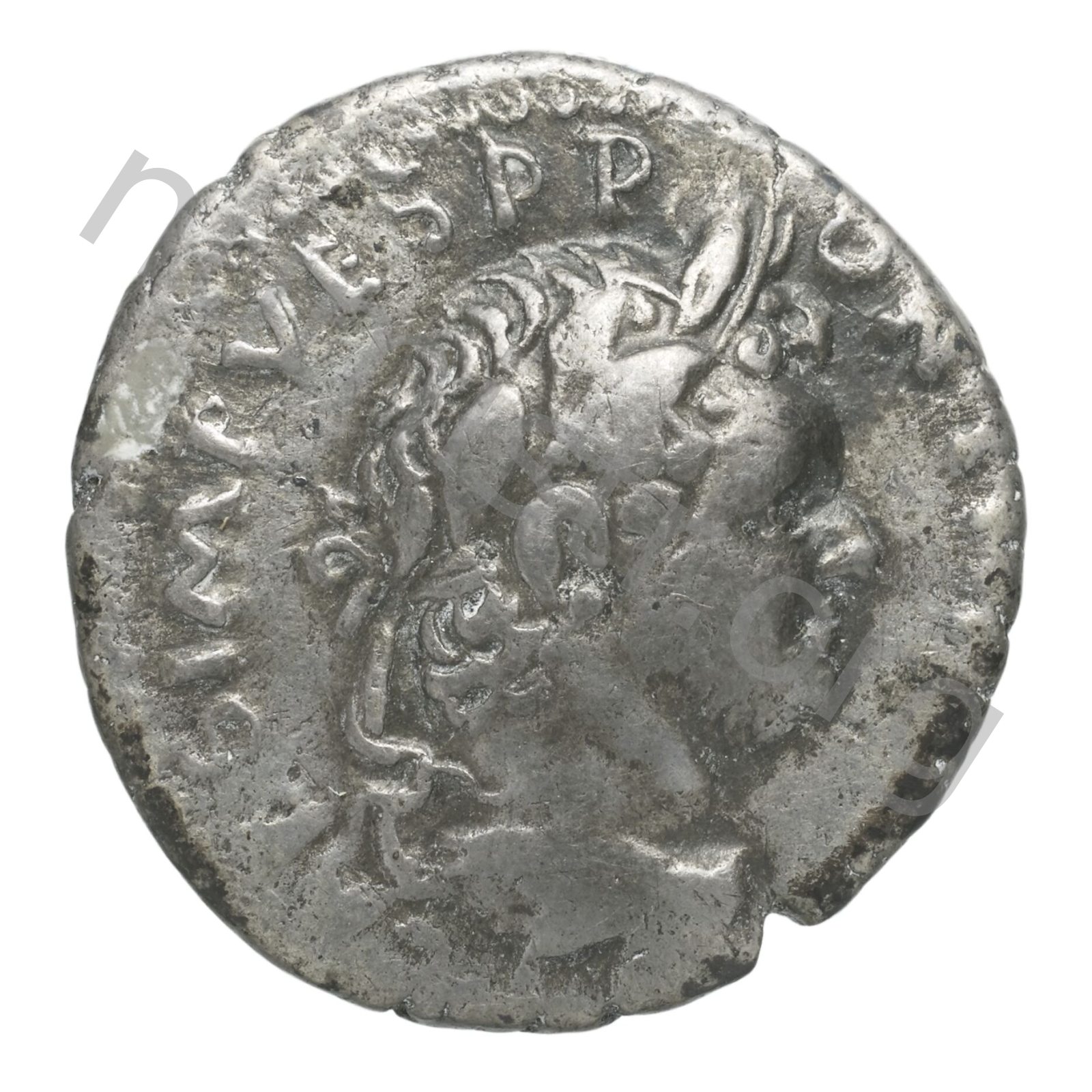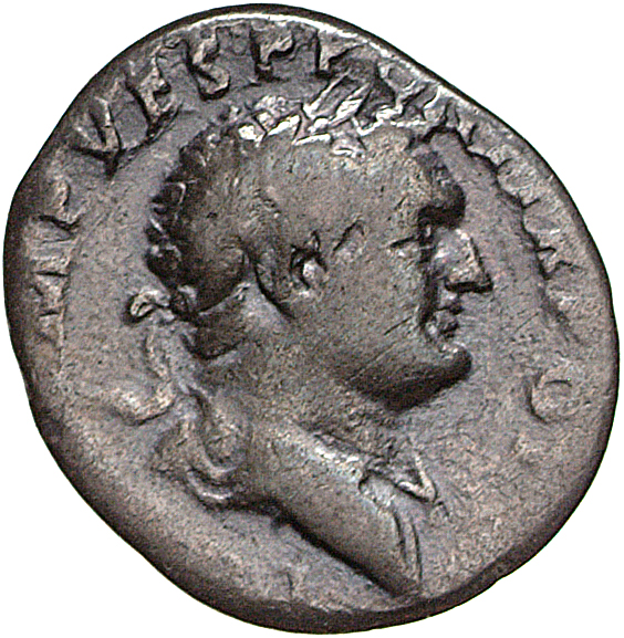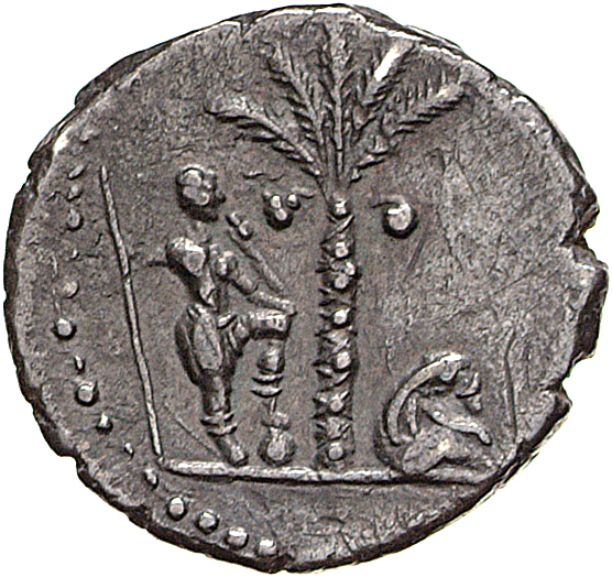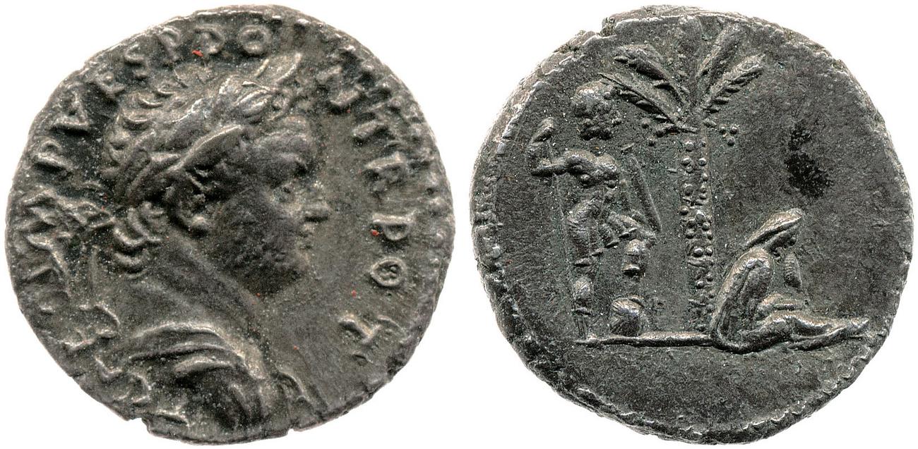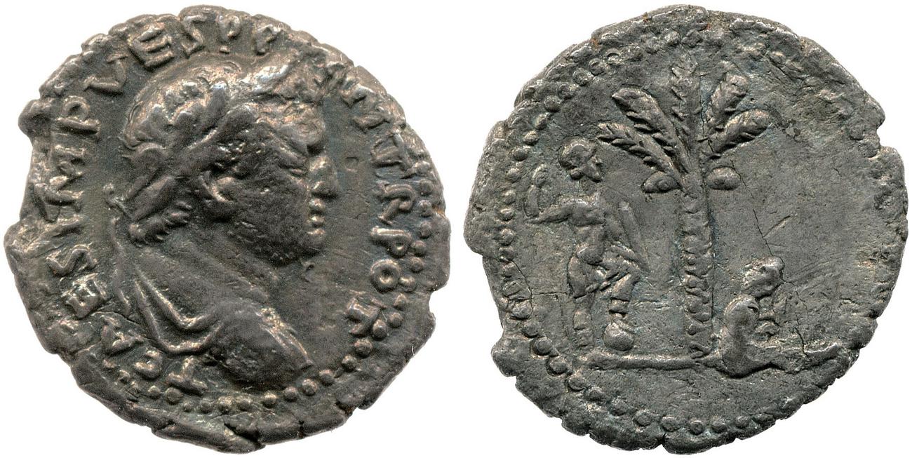 Titus mızrak ve parazonium tutarak ayakta duruyor ayağını hurma ağacının solundaki miğferin üzerine koyuyor; sağda oturan Yahudiye
